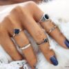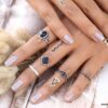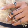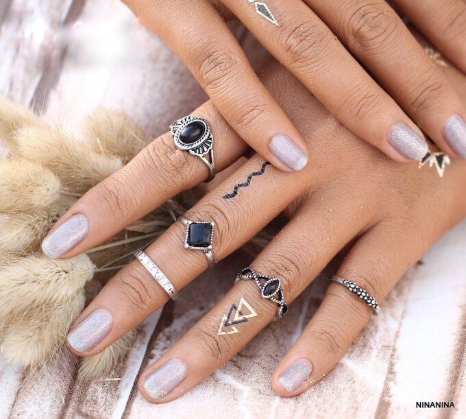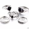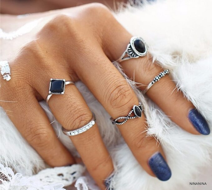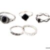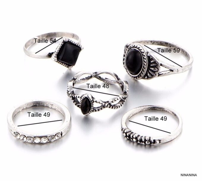 Lot de 5 bagues et bagues de phalange bohème en métal argenté et résine noire. Livré dans sa pochette d’organza.