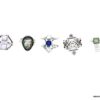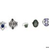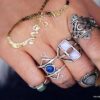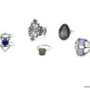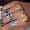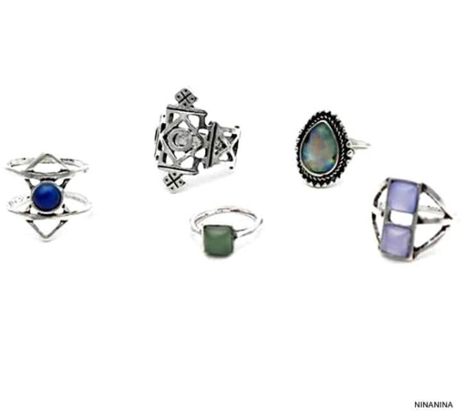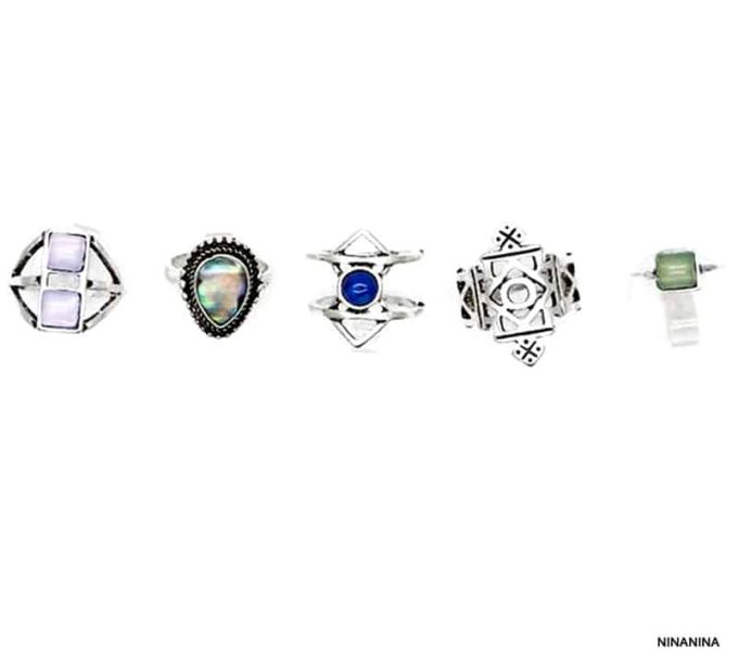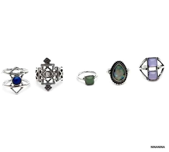 Set de 5 bagues et bagues de phalange bohème géométriques en métal argenté et résine bleue et blanche.