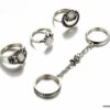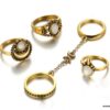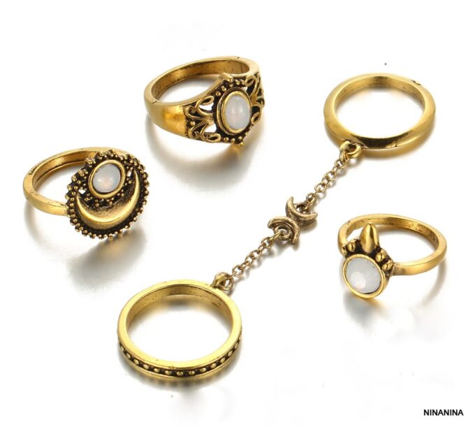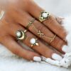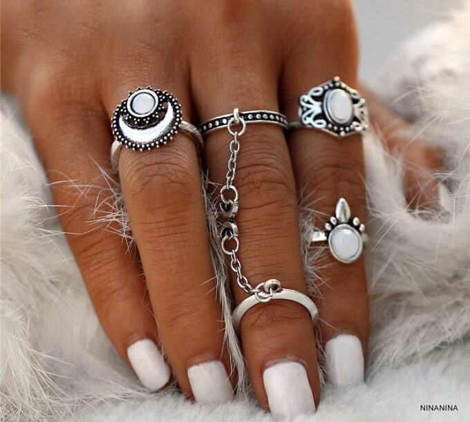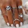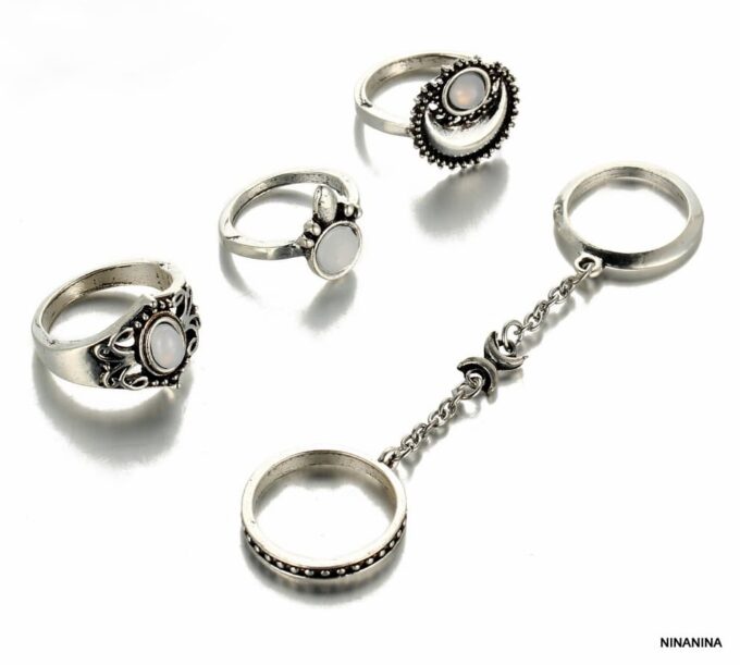 Lot de 5 bagues et bagues de phalange bohème en métal argenté et résine blanche. Livré dans sa pochette d’organza.