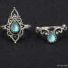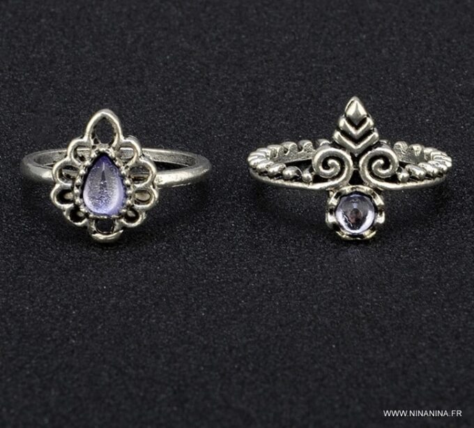 Lot de 7 bagues et de bagues de phalange bohème en métal argenté ciselé et résine mauve et bleu turquoise.