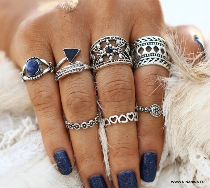 Soyez le premier à laisser votre avis sur “Lot de bagues argentées et bleu style bohème chic”