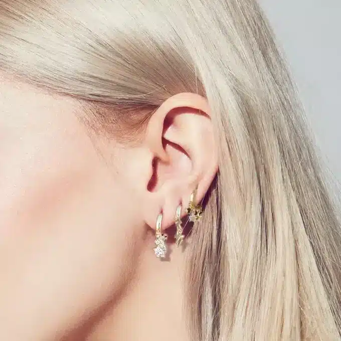 L’accumulation de bijoux est tendance et les mini créoles ne dérogent pas à la règle ! La nouveauté de la saison ? Le port en accumulation le long du lobe : en double, en triple, en mix and match… La mode des piercings multiples (trois trous au minimum : deux d’un côté, un de l’autre) permet désormais à certaines de les multiplier.