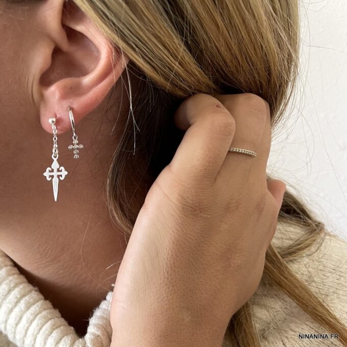 Un anneau tout fin en argent 925, une petite croix en zirconium blanc qui tombe de l’oreille, ces Mini creoles croix argent 925 zirconium blanc ne manquent pas de caractère! A l’oreille d’un homme autant qu’à celle d’une femme, leur look très rock fera tout son effet!