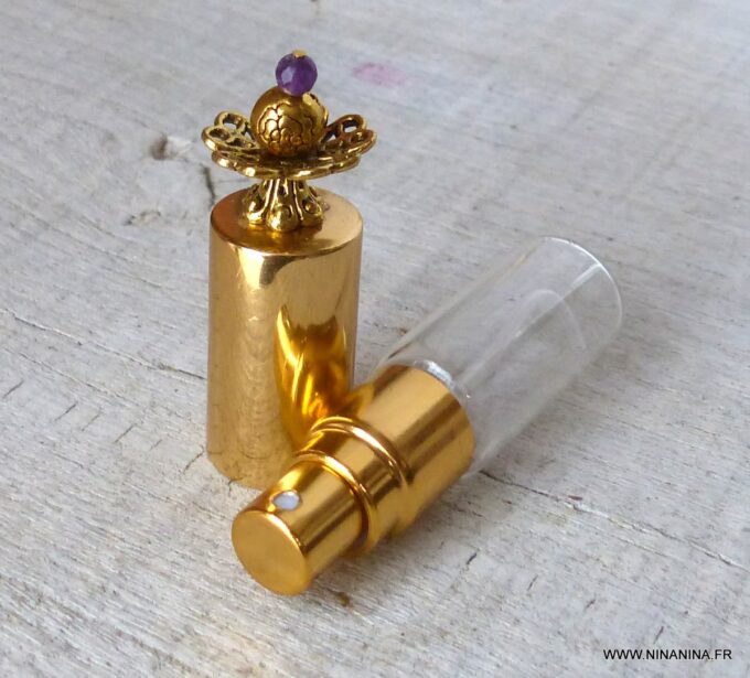 Composé d’un flacon parfum rechargeable cylindrique en verre assorti d’une pompe spray en métal doré rehaussée d’une petite perle ronde en améthyste véritable, il se glisse dans une trousse beauté, une valise ou un sac à main.