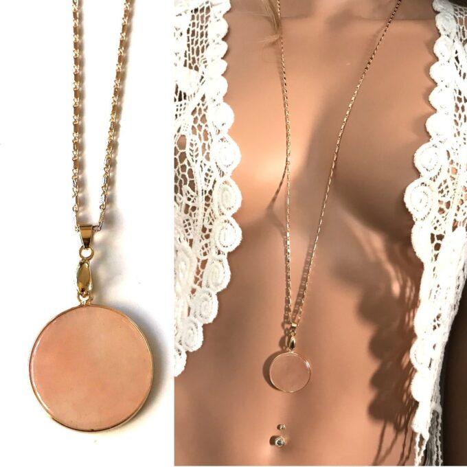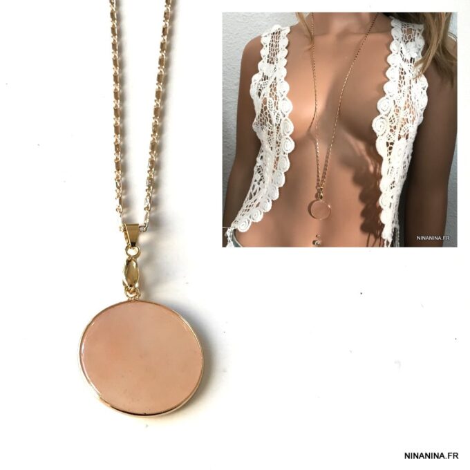 Optez pour ce Pendentif Aventurine rose rond longue chaine dorée en laiton doré qui ajoutera une touche boheme à n’importe quelle tenue ! Un pendentif rond serti d’aventurine naturelle montée sur une longue chaine maille fantaisie en laiton doré, ce collier long de 90 cm vous fera craquer à coup sûr ! Il est terminé par un fermoir mousqueton à ressort sûr et facile d’utilisation et d’une chainette de réglage.