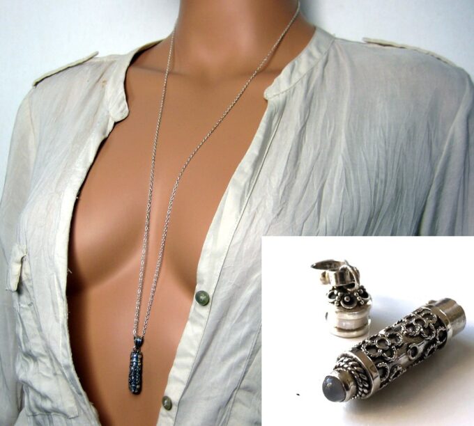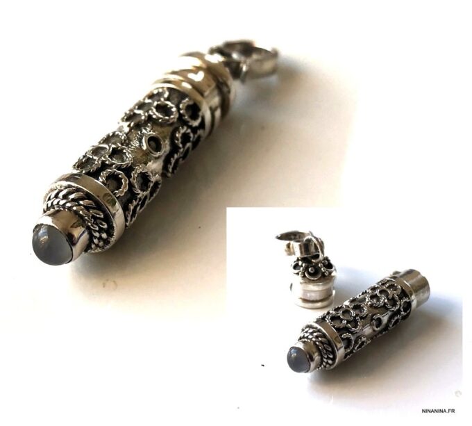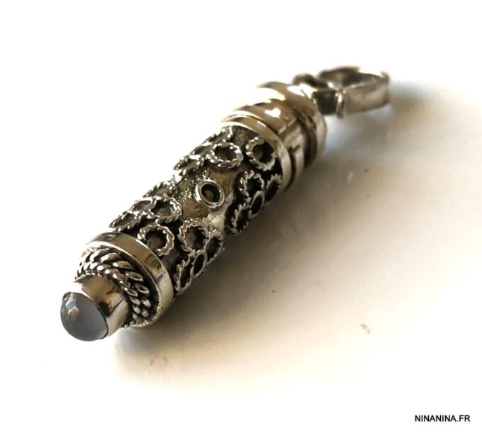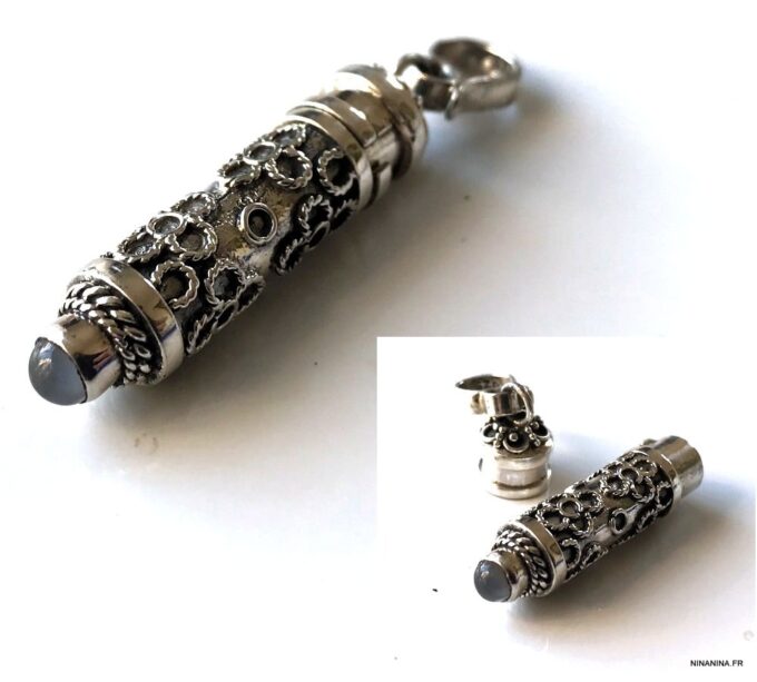 Découvrez le Pendentif reliquaire urne Argent 925 Et Pierre de Lune composé d’un pendentif cylindrique en argent 925 ciselé et serti d’une pierre en pierre de lune véritable, monté sur une chaînette maille forçat en argent 925.