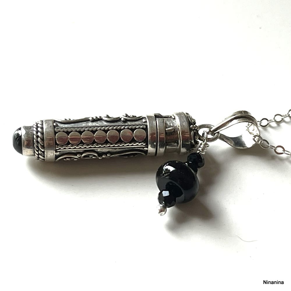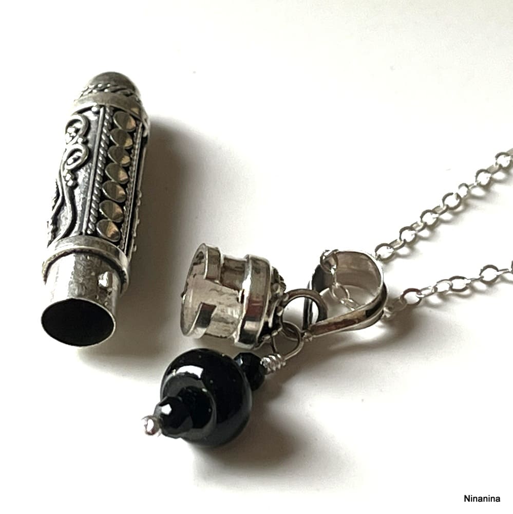 Découvrez le Bijou funéraire Collier urne Argent 925 Et Onyx noir composé d’un pendentif cylindrique en argent 925 ciselé et serti d’une pierre en onyx noir véritable, monté sur une chaînette maille forçat en argent 925. Ce pendentif est destiné à recevoir une pincée de cendres de l’être disparu ou une mèche de cheveux.