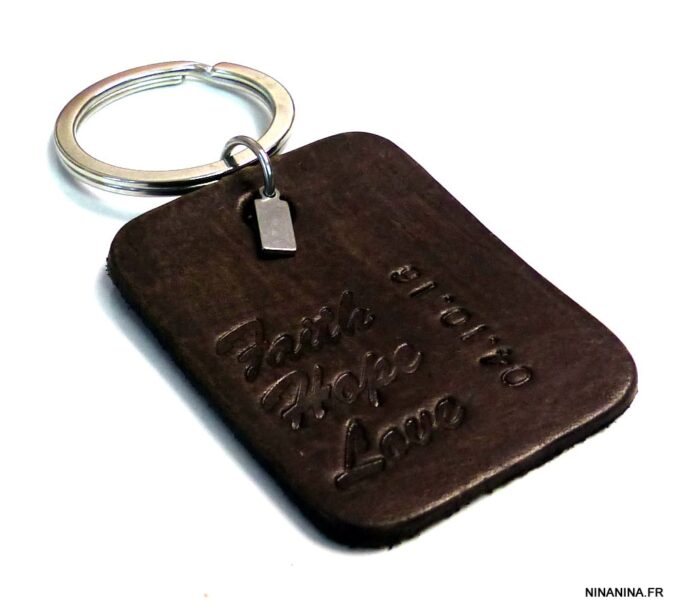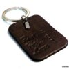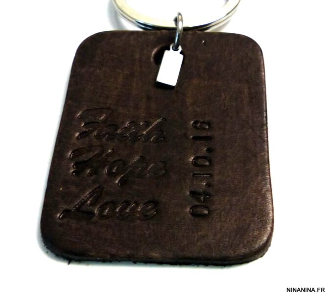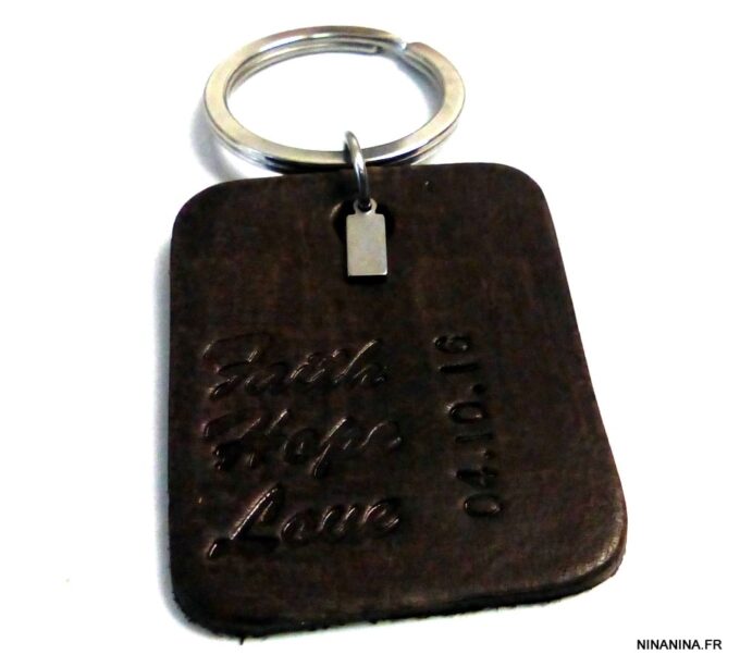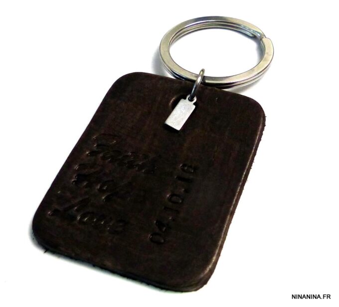 Porte clé homme pendentif cuir date personnalisée, martelé et teint à la main composé d’un pendentif rectangulaire en cuir marron chocolat et d’une breloque rectangulaire en acier inoxydable montés sur un anneau de porte-clé en acier inoxydable.