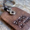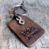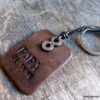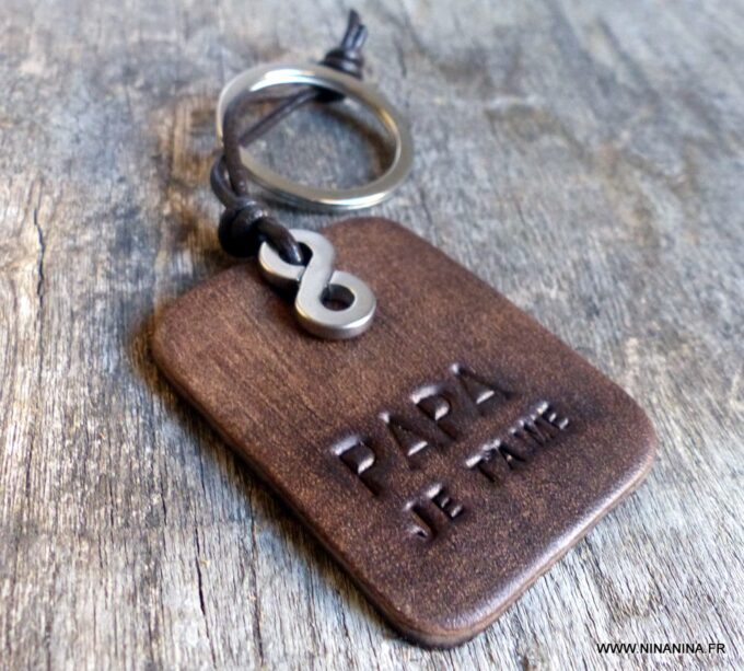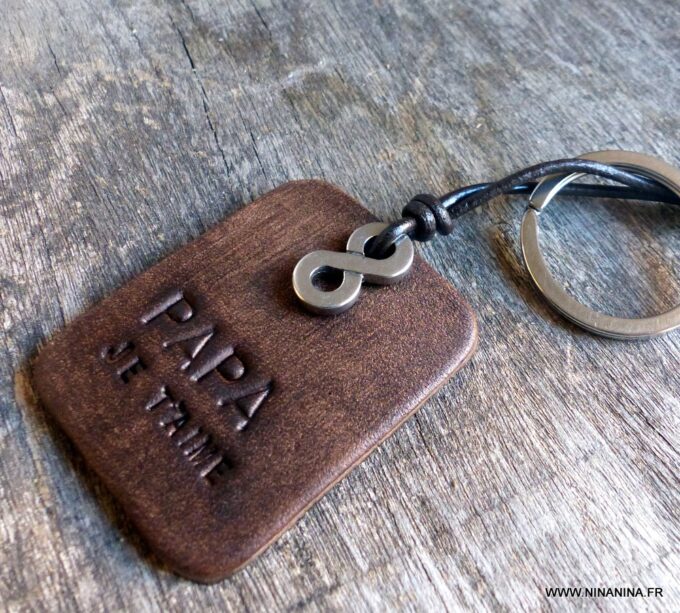 Porte clé cuir homme infini acier inoxydable personnalisé JE T AIME PAPA composé d’un pendentif rectangulaire en cuir marron chocolat gravé à la main et d’un pendentif infini en acier inoxydable montés sur cordon de cuir et un anneau de porte-clé en acier inoxydable.