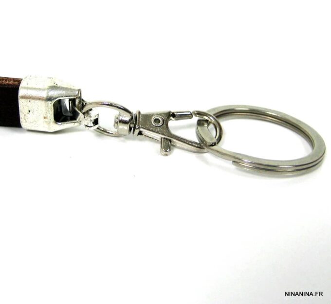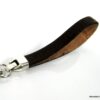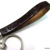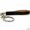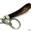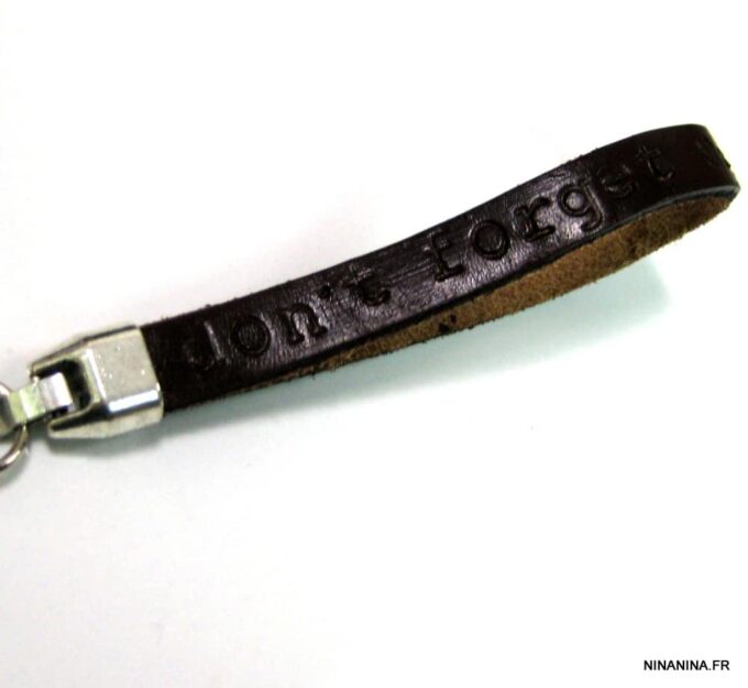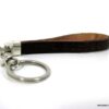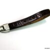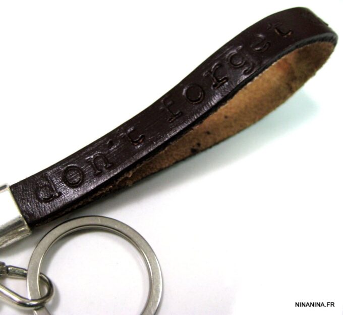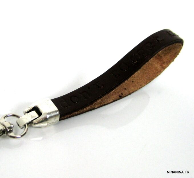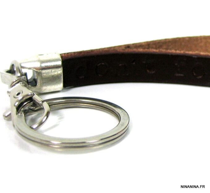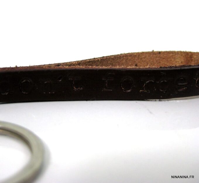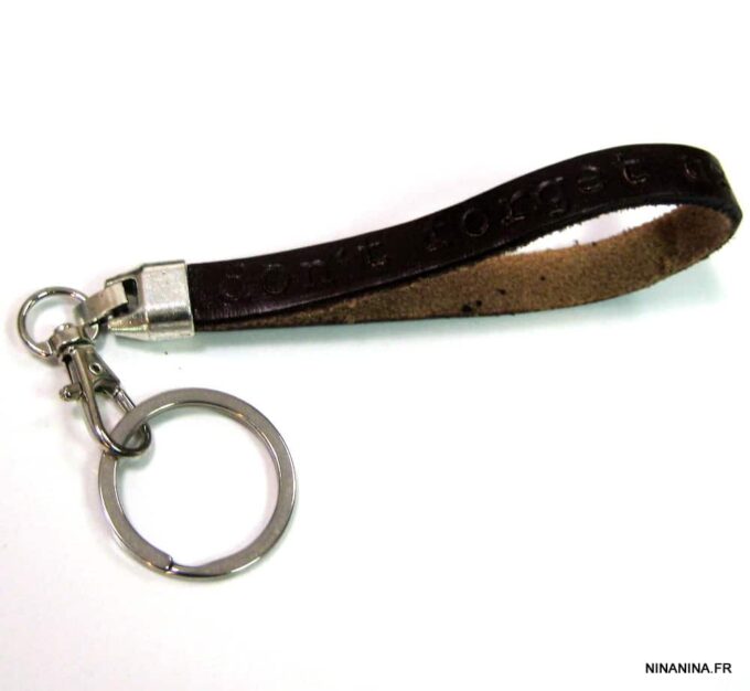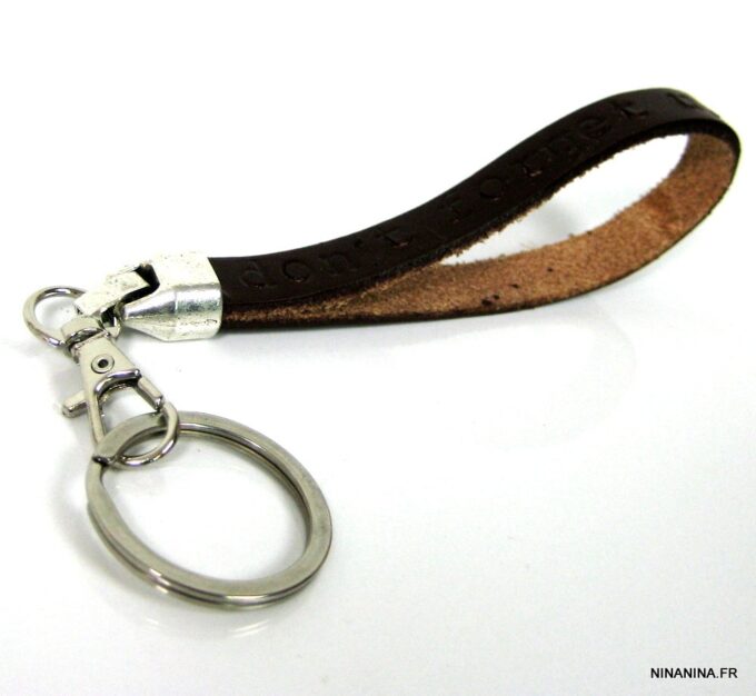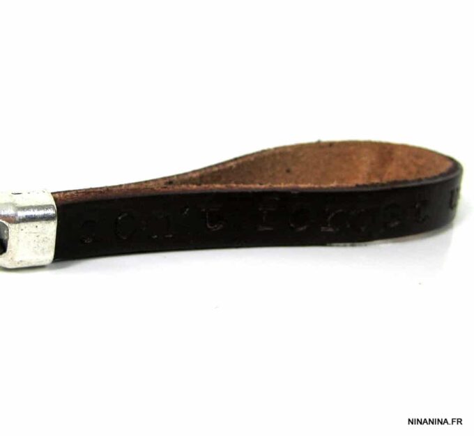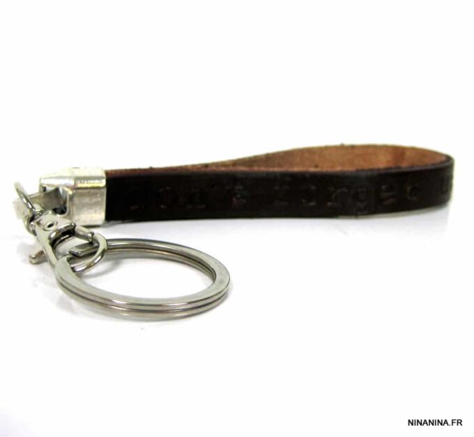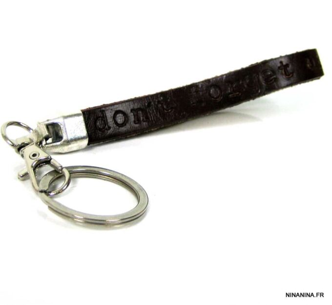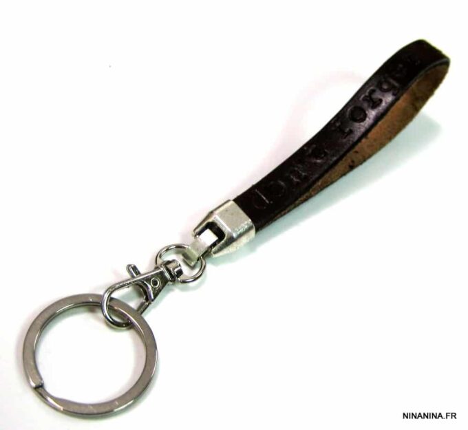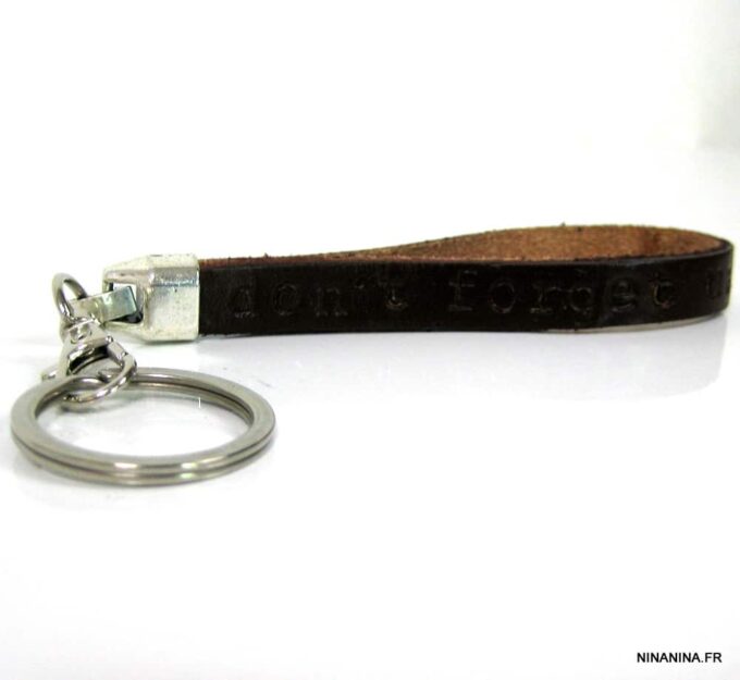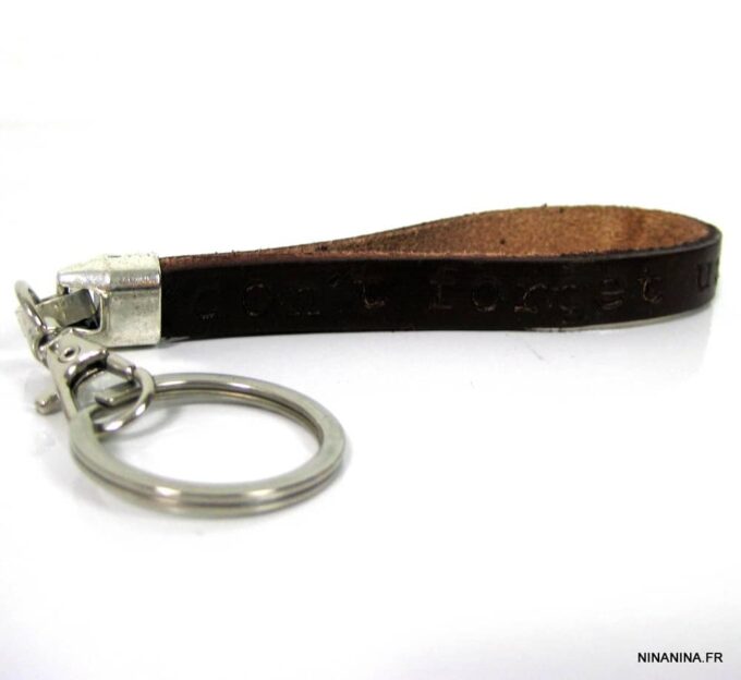 Porte clé homme cuir message personnalisé composé d’une lanière double en cuir marron chocolat gravée à la main et montée sur un mousqueton et un anneau de porte-clé en acier inoxydable.