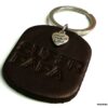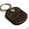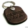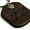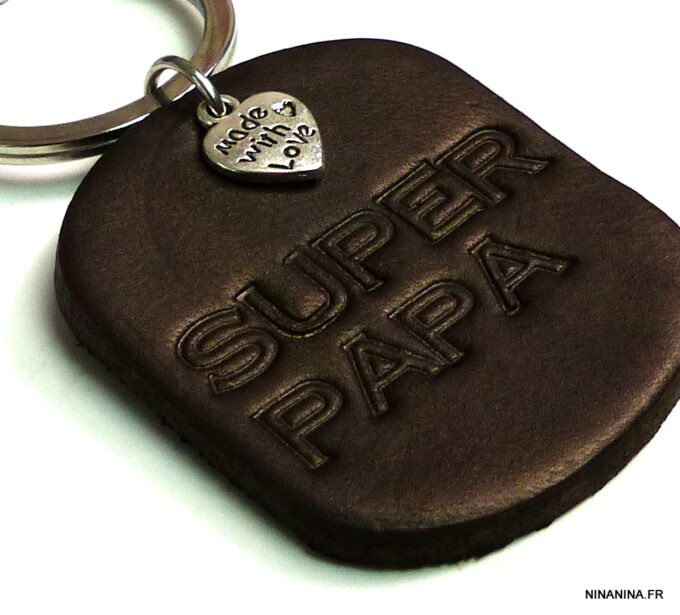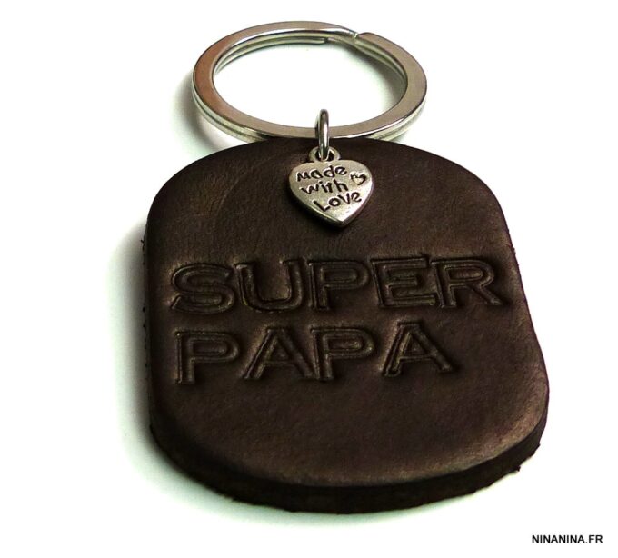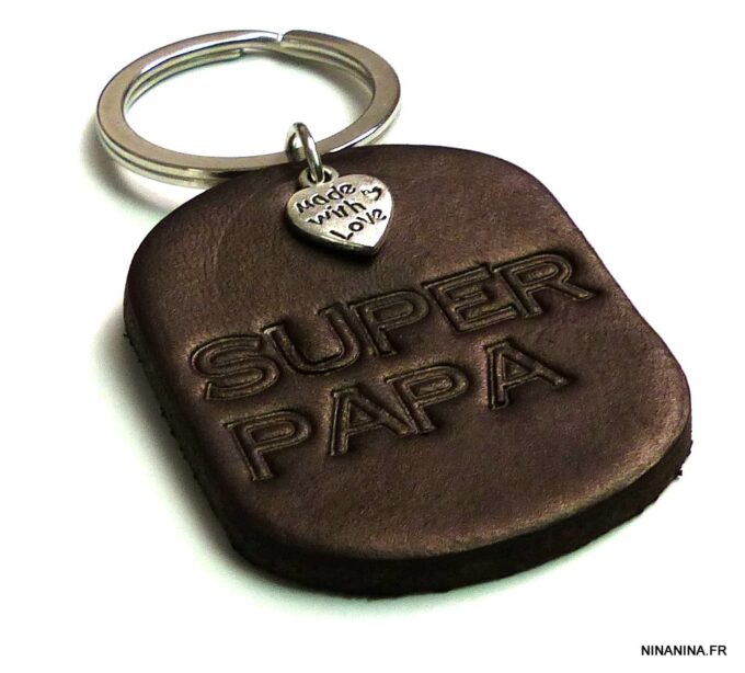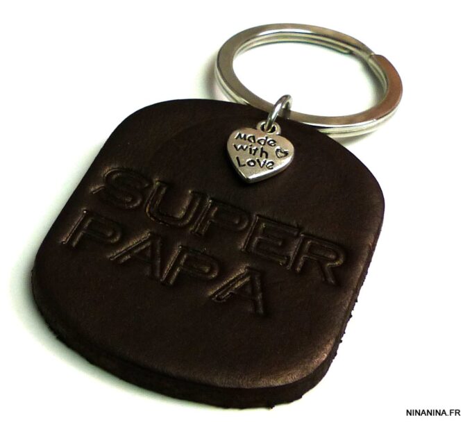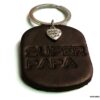 Porte clé personnalisé fete des peres gravé super papa martelé et teint à la main composé d’un pendentif rectangulaire en cuir marron chocolat et d’un petit coeur gravé en métal argenté montés sur un anneau de porte-clé en acier inoxydable.