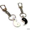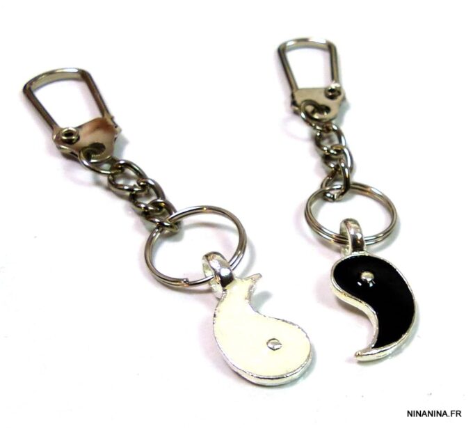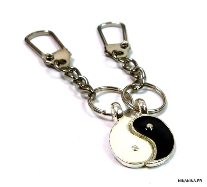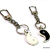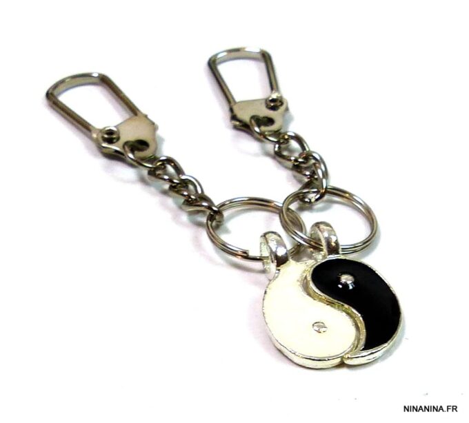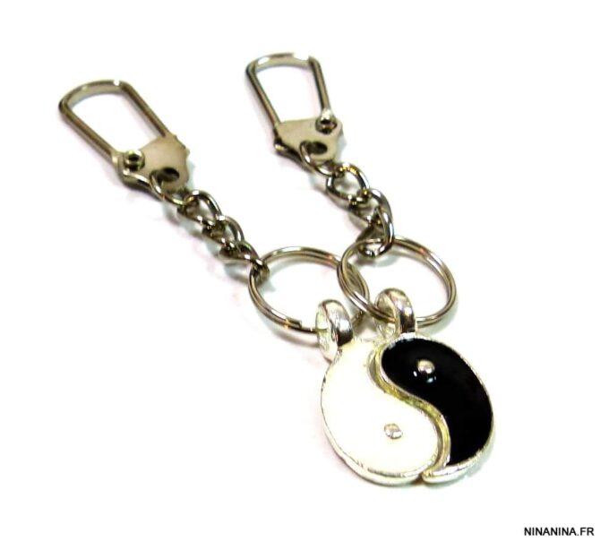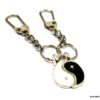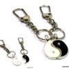 Porte clé homme double yin yang acier inoxydable composé d’un pendentif yin yang en 2 parties métal argenté émaillé noir et blanc montées chacune sur un anneau porte-clé et mousqueton en acier inoxydable.