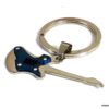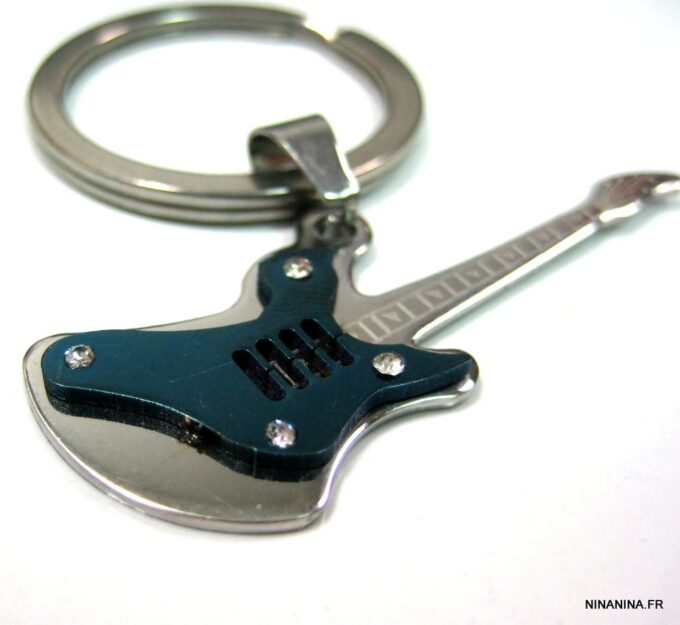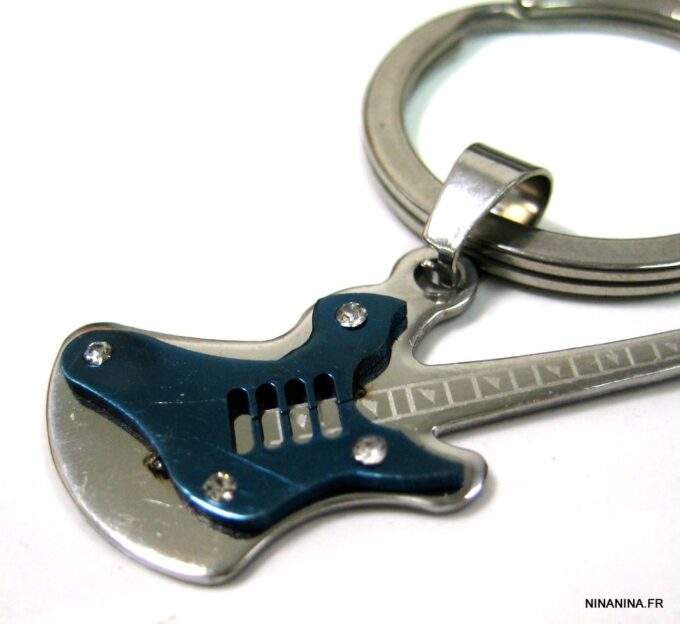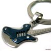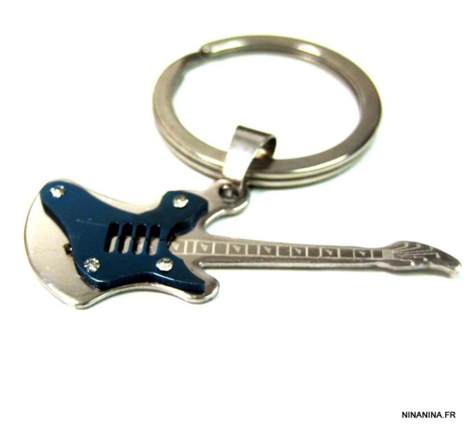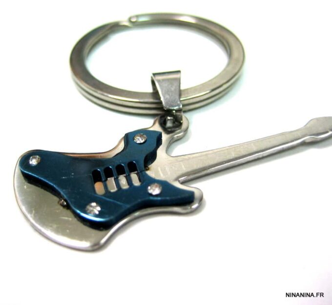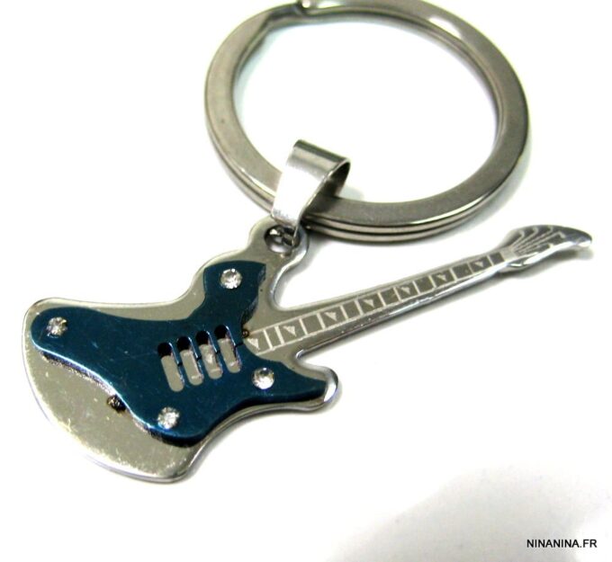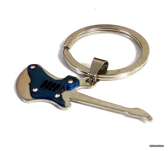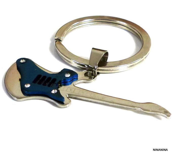Porte clé homme guitare bleue acier inoxydable composé d’un pendentif guitare bass en acier inoxydable bleue et argent monté sur un anneau de porte-clé en acier inoxydable.