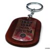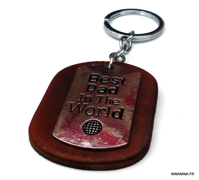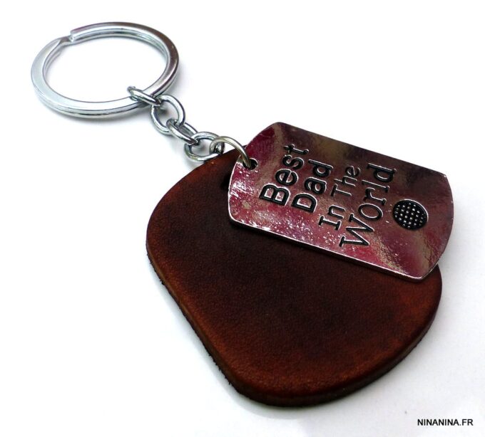 Porte clé homme cuir BEST DAD IN THE WORLD composé d’un pendentif ovoide en cuir marron chocolat et d’un pendentif MEILLEUR PAPA DU MONDE en métal argenté montés sur un anneau de porte-clé.