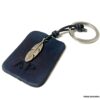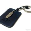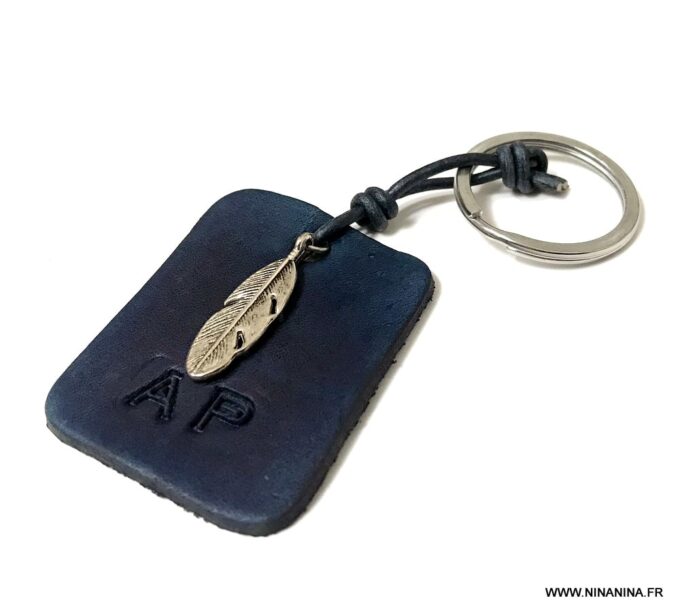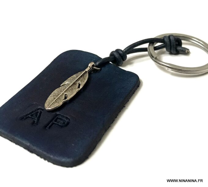 Porte clé plume cuir personnalisé pour homme martelé et teint à la main composé d’un pendentif rectangulaire en cuir marron chocolat et d’un pendentif plume en métal argenté montés sur un anneau de porte-clé en acier inoxydable.