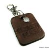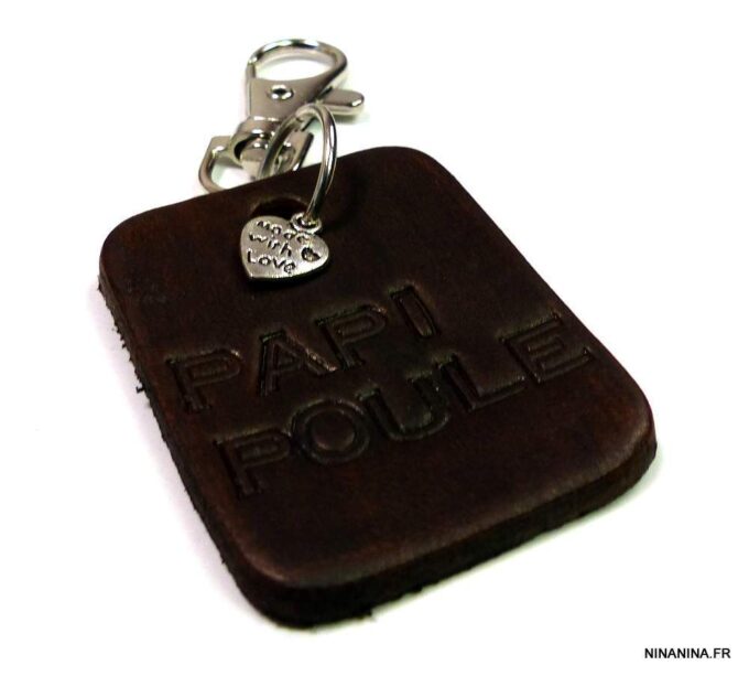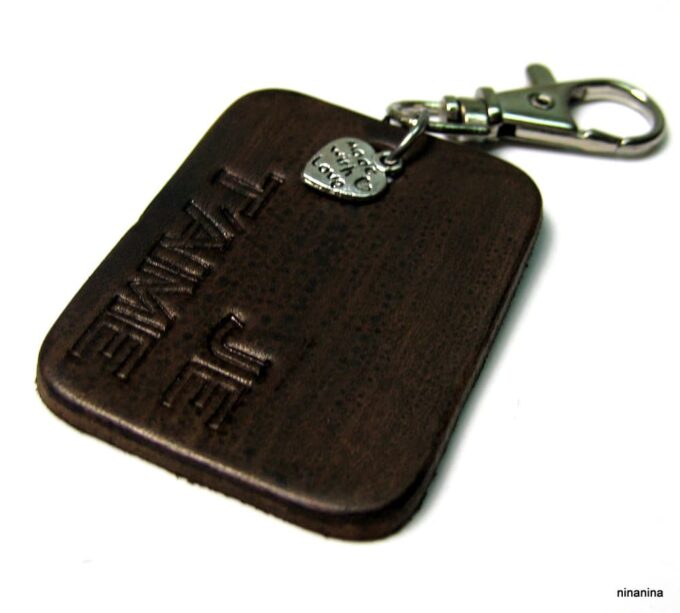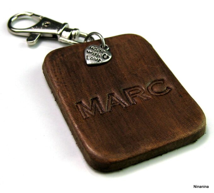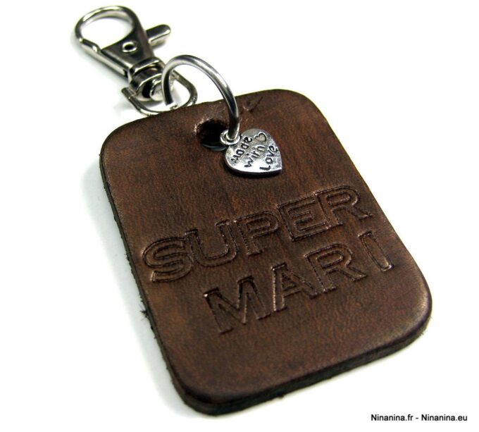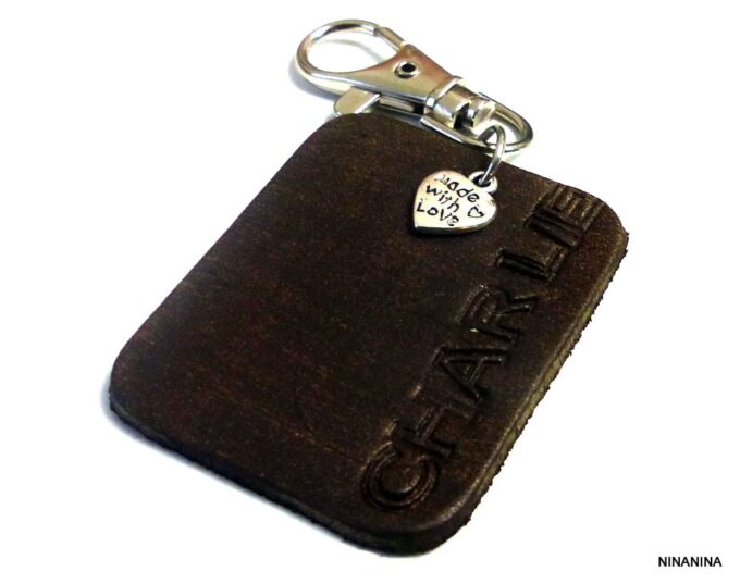 Porte clés cuir personnalisé prénom martelé et teint à la main composé d’un pendentif rectangulaire en cuir marron chocolat et d’un petit coeur gravé en métal argenté montés sur un mousqueton en métal argenté.