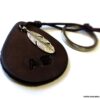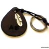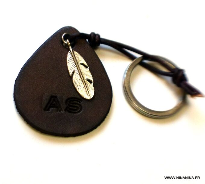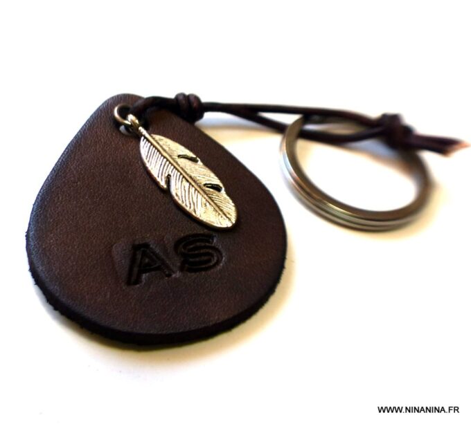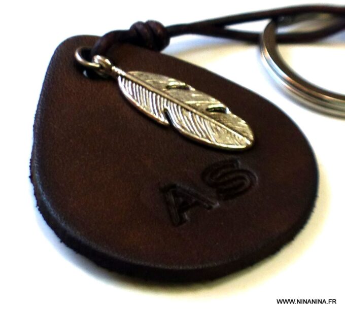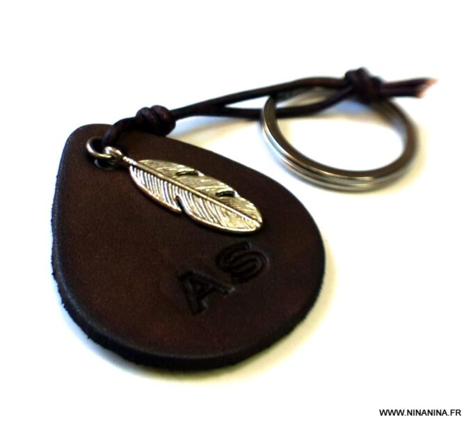 Porte clé personnalisé cuir gravé initiales martelé et teint à la main composé d’un pendentif en forme de goutte en cuir marron chocolat et d’un pendentif plume en métal argenté montés sur un anneau de porte-clé en acier inoxydable.
