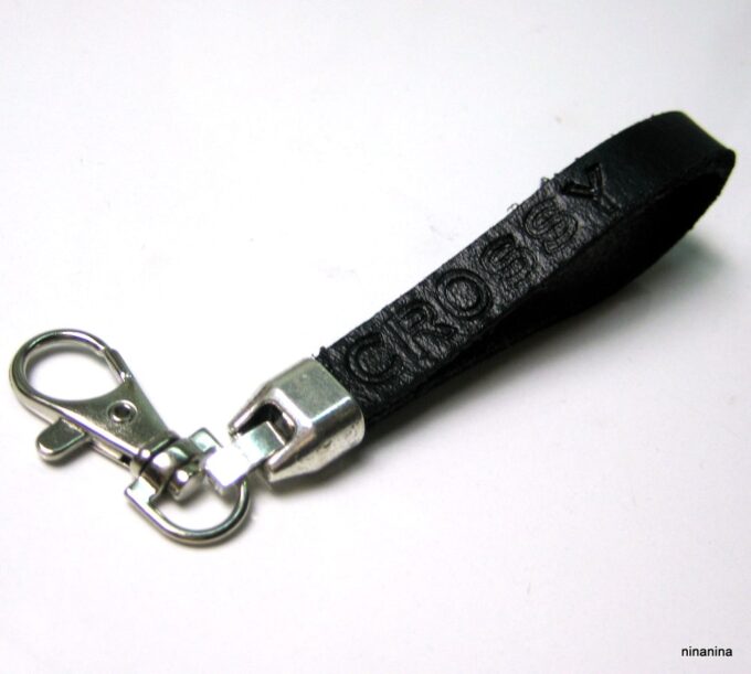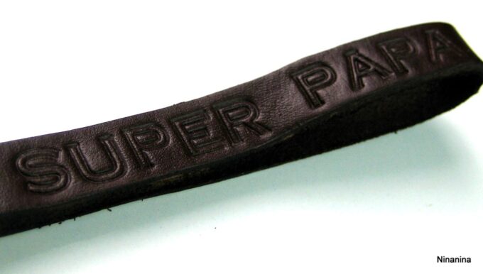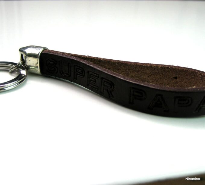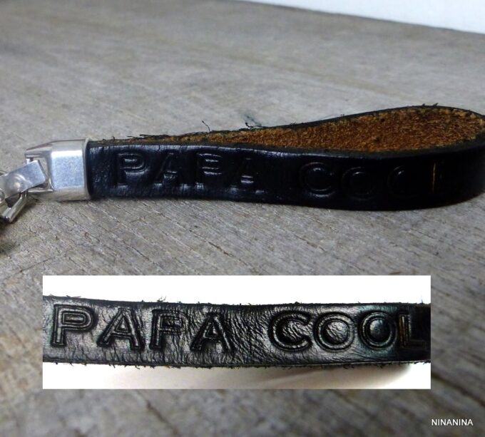 Porte clé papa personnalisé lanière en cuir composé d’une lanière double en cuir noire martelée à la main et montée sur un fermoir mousqueton en acier inoxydable.