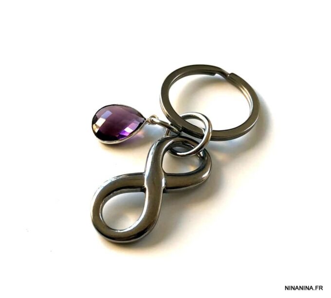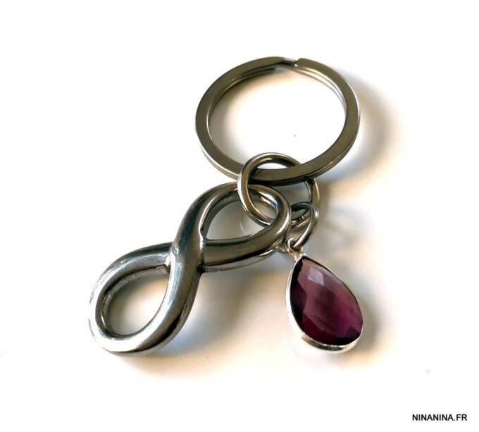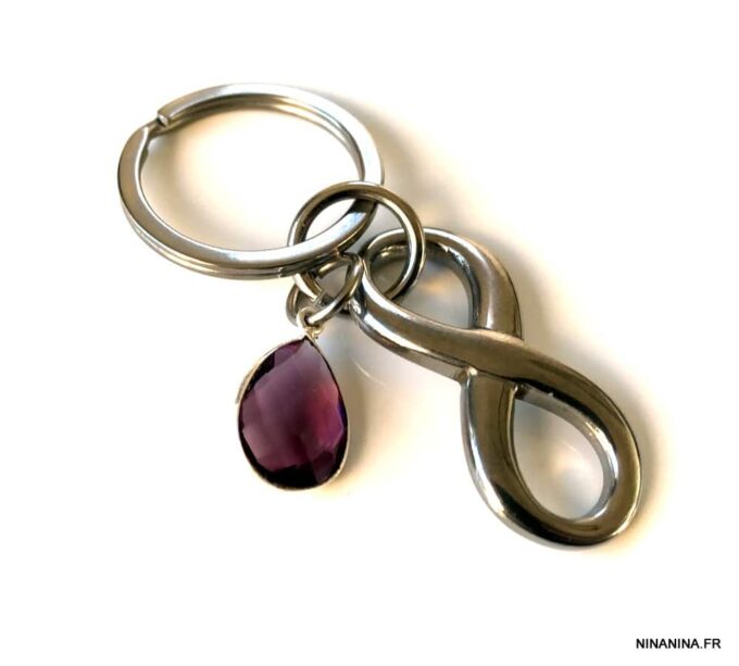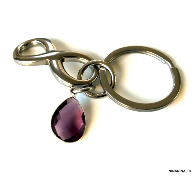 Craquez pour ce Porte Clé Pierre de Naissance signe Infini Acier inoxydable constitué d’un pendentif symbole infini en Acier inoxydable et d’un pendentif en forme de goutte en Améthyste naturelle montés sur un anneau de porte-clé en acier argenté.