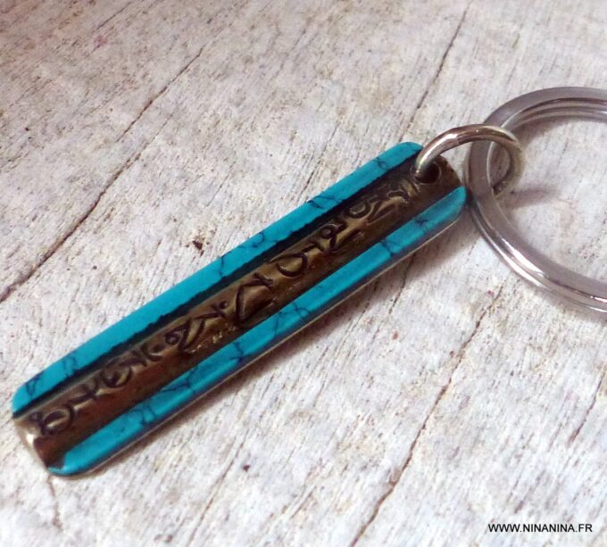 Ce porte clé porte bonheur homme en turquoise naturelle et Acier inoxydable de haute qualité est fabriqué à la main, de façon artisanale et en série limitée dans notre atelier du sud de la France. Dim du pendentif bouddhiste : 5 X 1 cm. Longueur totale (anneau compris) : 8,5 cm env.