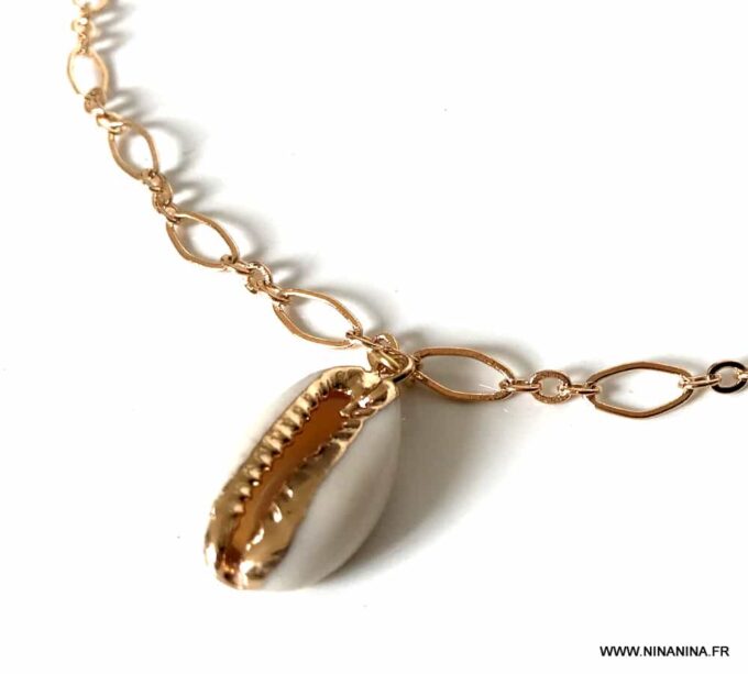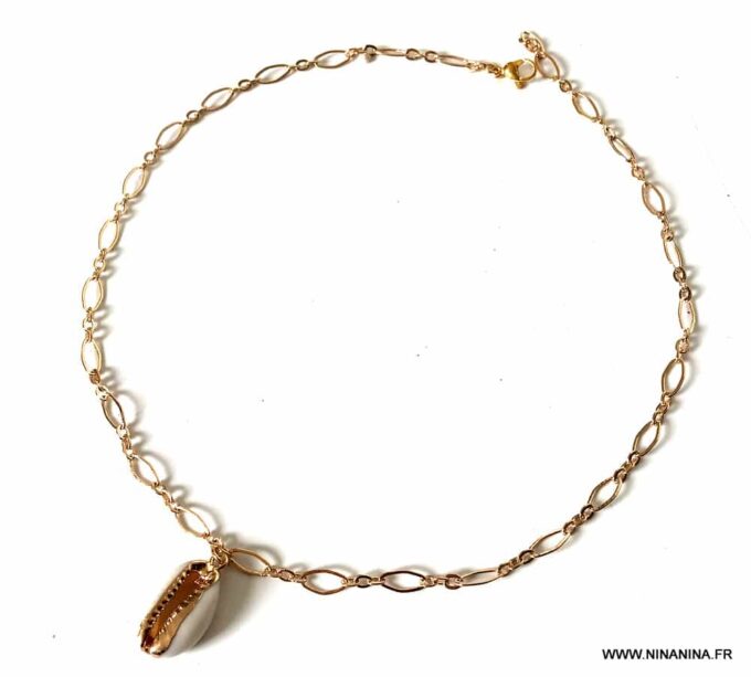 Ce collier féminin est composé d’un pendentif coquillage cauri , aussi appelé coquillage grain de café, doré à l’or fin monté sur une chaine en plaqué or 18 carats et terminé par un fermoir mousqueton, sûr et facile d’utilisation et d’une chainette de réglage.