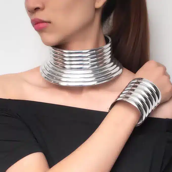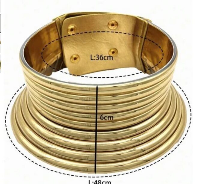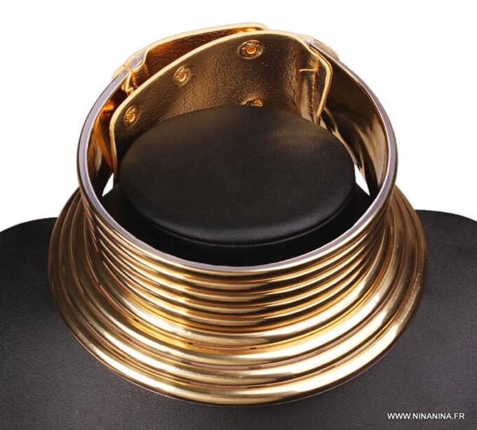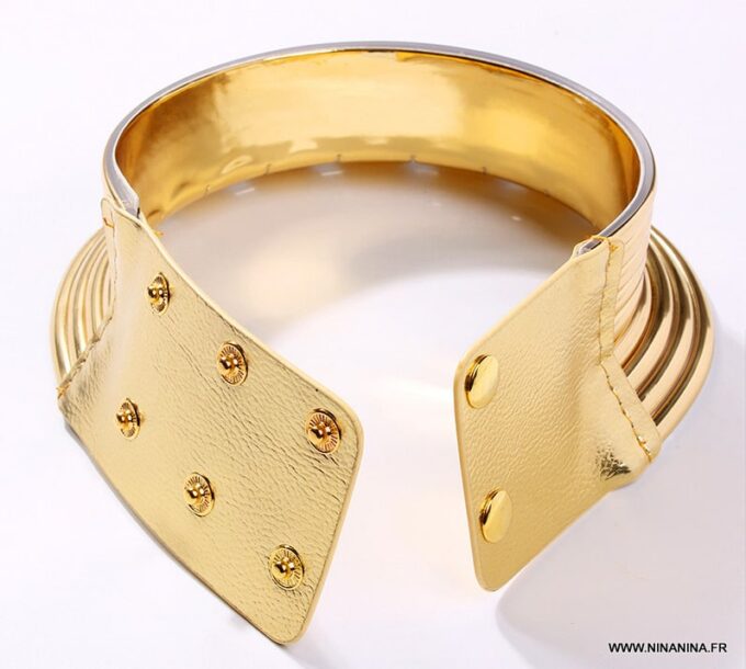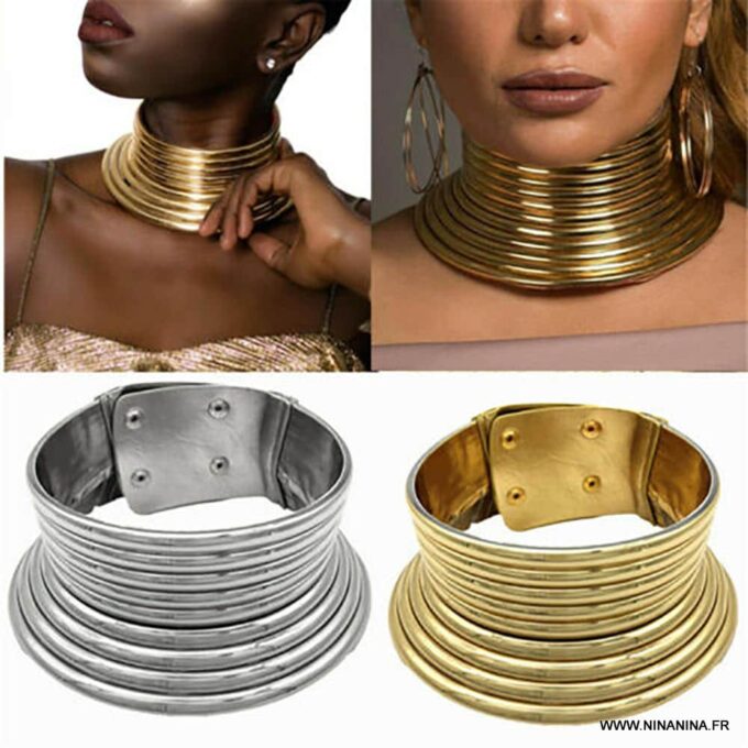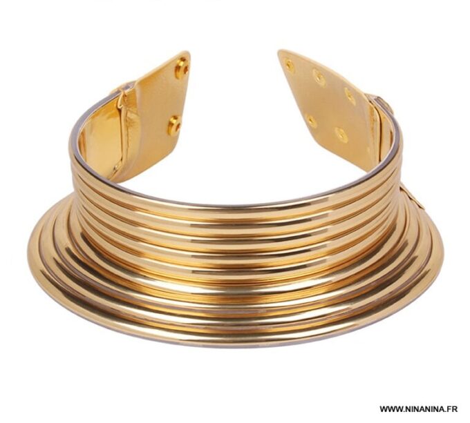 Ce magnifique Collier Afrique Femme Torque Extra Large doré ne manquera pas de vous séduire ! Épousant parfaitement les lignes du cou il se porte avec les cheveux relevés et le buste dégagé. Ce sublime bijou deviendra le favori de votre garde robe, son effet est chic et sophistiqué.