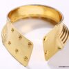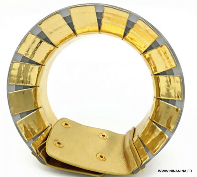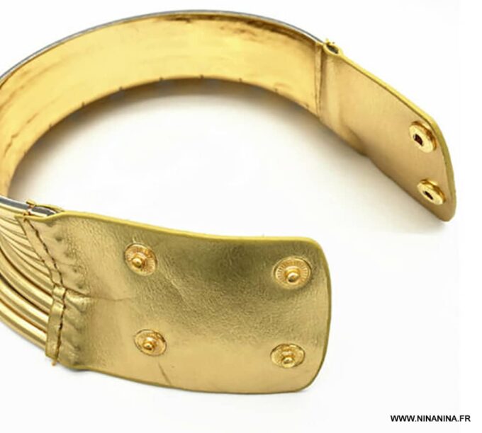 Ce magnifique collier torque femme est fabriqué à la main, de façon artisanale et en série limitée par des artisans au savoir-faire ancestral. Largeur : 6,5 cm. Périmètre : 44 cm. Poids : 185 g. Disponible également en argenté sur commande.