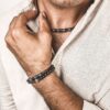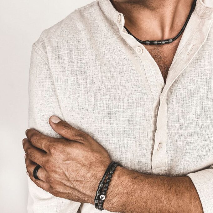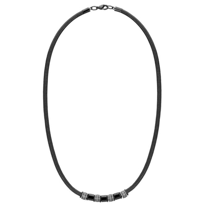 Ce ras de cou pour homme tendance en cuir lisse et acier inoxydable est l’accessoire idéal pour apporter une touche sophistiquée à votre look. Composé de perles cylindriques en acier inoxydable argent et noir montées sur un cordon de cuir lisse noir de 5mm de diamètre, il allie sobriété et raffinement. Son design épuré et intemporel s’adapte à toutes les occasions, du quotidien aux événements plus habillés.
