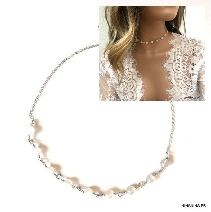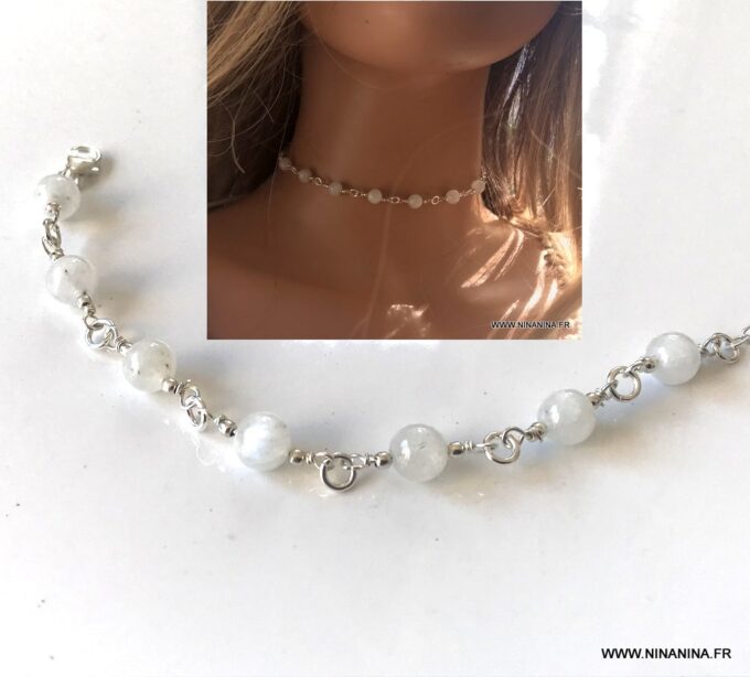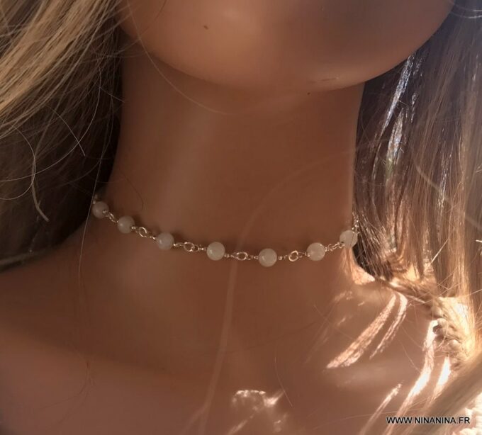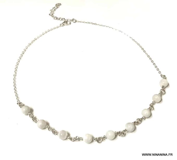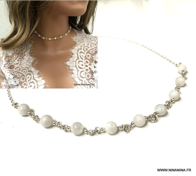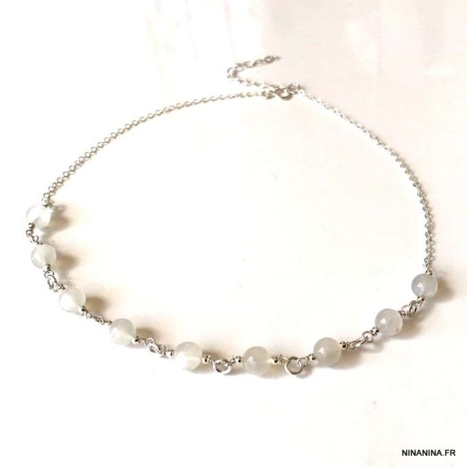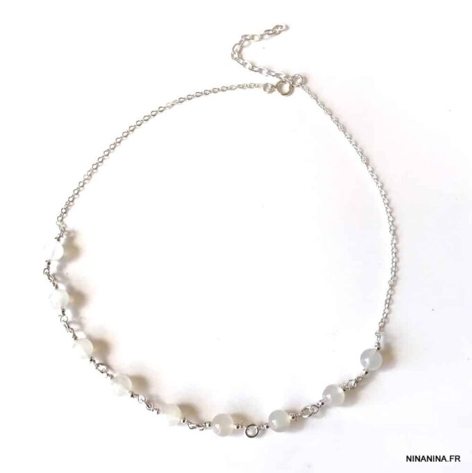 Découvrez ce superbe Ras de cou perle en Pierre de Lune naturelle et Argent 925 constitué de perles en pierre de lune naturelle montées sur une chaine maille forçat en argent 925 et terminé par un fermoir mousqueton en Argent 925, sûr et facile d’utilisation.
