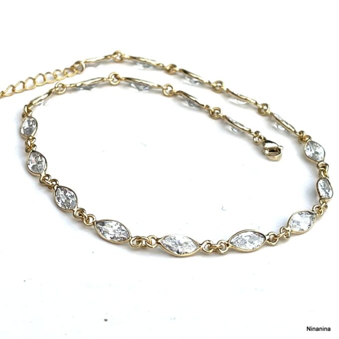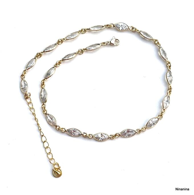 Faites briller votre décolleté de mille feux avec ce Ras de cou zirconium blanc – Collier femme plaqué or composé de petits oxydes de zirconium en forme de goutte délicatement répartis sur une fine chaine en plaqué or. Ce ras de cou femme, aussi appelé collier ras de cou ou collier ras du cou, est terminé par un délicat fermoir rond à ressort, sûr et facile d’utilisation.