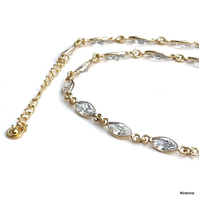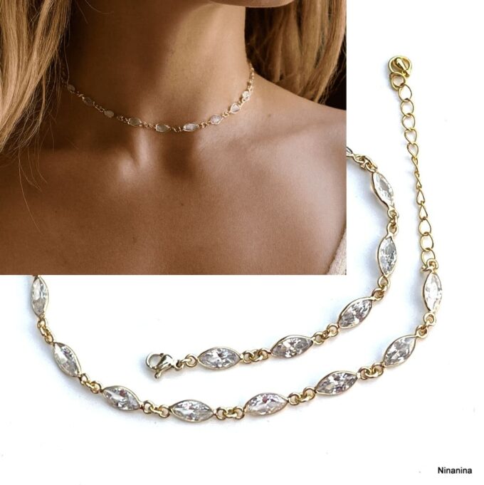 Ce Collier ras de cou zirconium est unique et fabriqué à la main, de façon artisanale dans notre atelier en France. Il est composé d’argent 925 plaqué or. Il s’agit d’une pièce faite sur mesure qui convient pour la majorité des statures, la longueur est de 35 cm + 4 cm de chainette de réglage. Merci de laisser un commentaire si vous souhaitez une autre longueur.