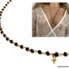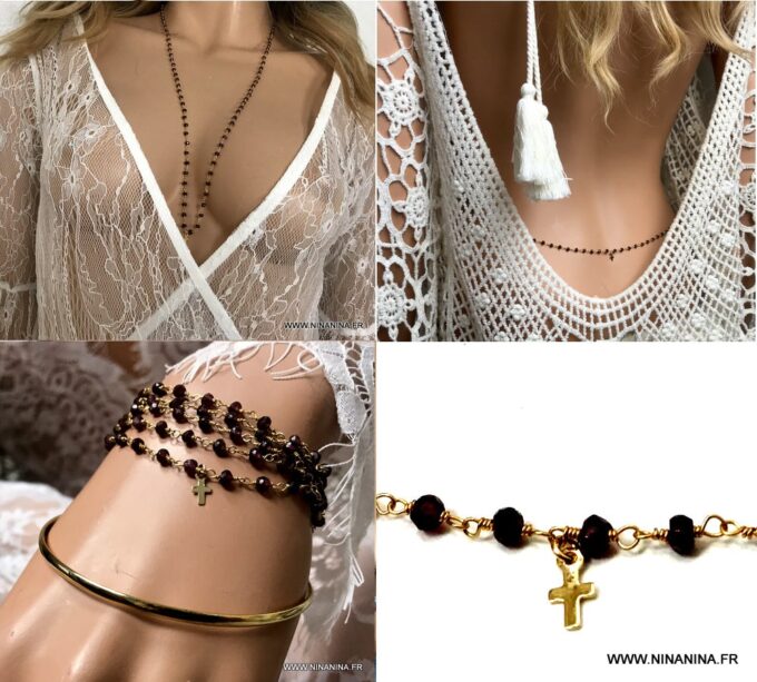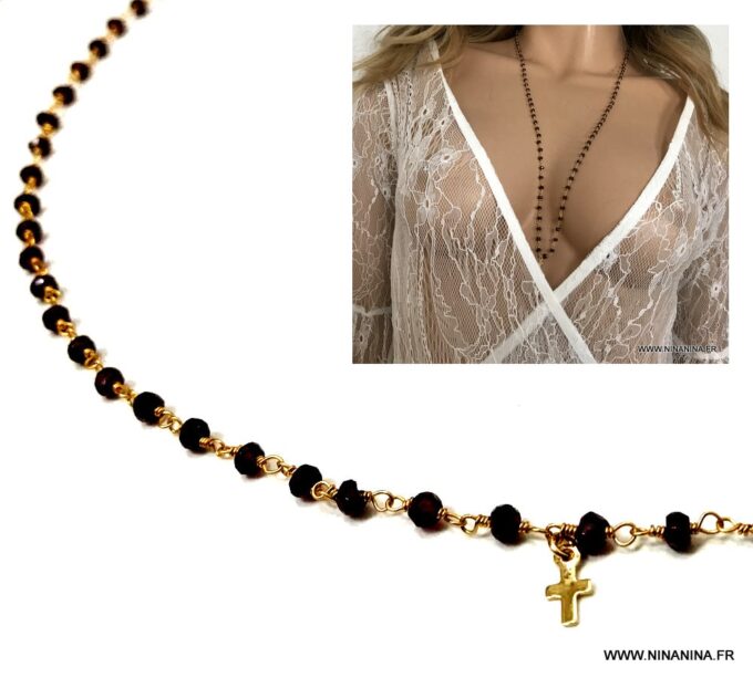 Ne cherchez plus, ce Sautoir avec croix plaqué or et pierres en spinelle noir en plaqué or 14 carats gold filled est faite pour vous ! Ce sautoir plaqué or est constitué d’une petite croix en Plaqué Or montée sur un chapelet de perles en spinelle noir sur fil Plaqué Or. Un fermoir rond à ressort sûr et facile d’utilisation vient parfaire le tout.