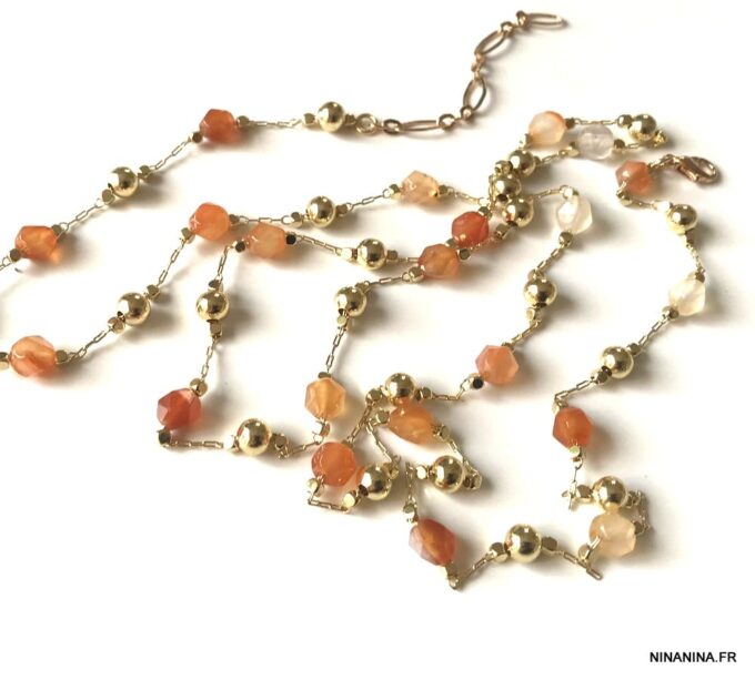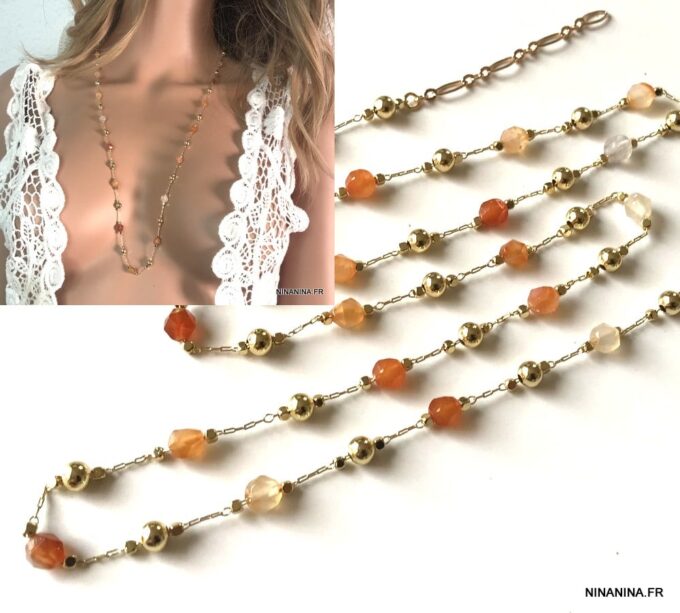 Optez pour ce splendide Sautoir Orange Pierre Cornaline naturelle et laiton doré et ses pierres fines en cornaline naturelle aux couleurs chaudes ! Composée de pierres semi précieuse allant du saumon clair à l’orange foncé et de billes en laiton doré montées sur une chainette aux maillons ovales, cette chaîne de taille se termine par un fermoir mousqueton sûr et facile d’utilisation et d’une chainette de réglage.
