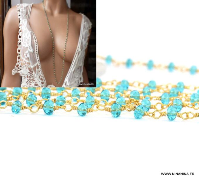 Si vous êtes fan de bijoux en pierres fines, et que vous recherchez un collier sautoir à la fois discret et original, ce Sautoir pierre semi précieuse topaze bleue plaqué or ne peut que vous émoustiller ! Vraiment original ce collier long en topaze bleue constitué de petites pierres en topaze bleue montées sur fil Plaqué or !