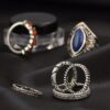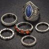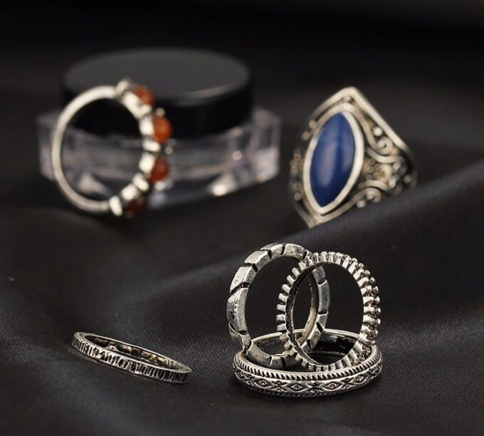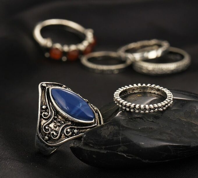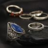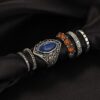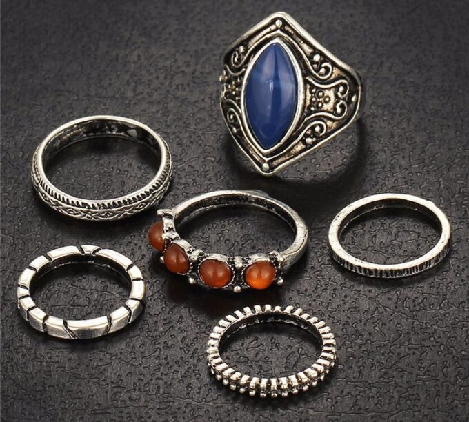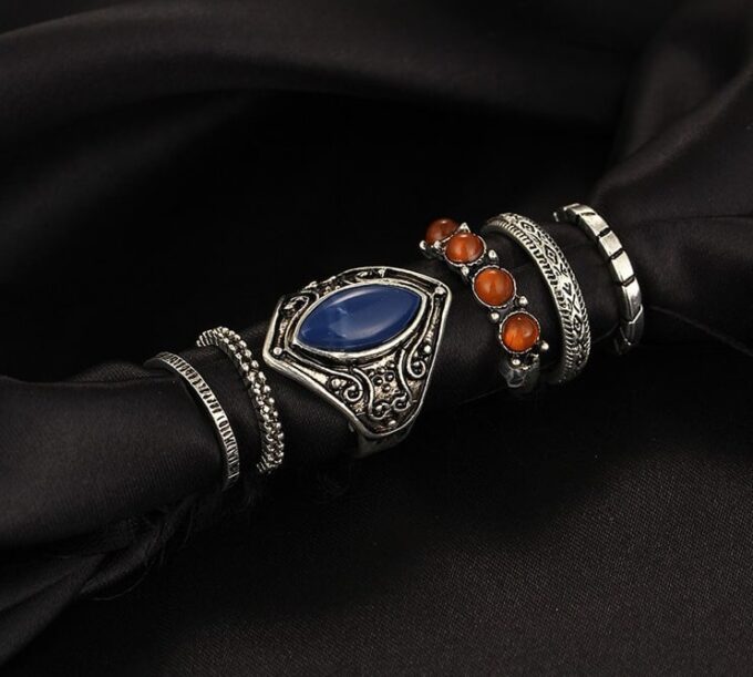 Lot bague femme bohème chic en métal argenté vieilli et résine bleue et orange.