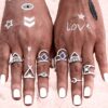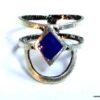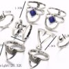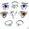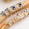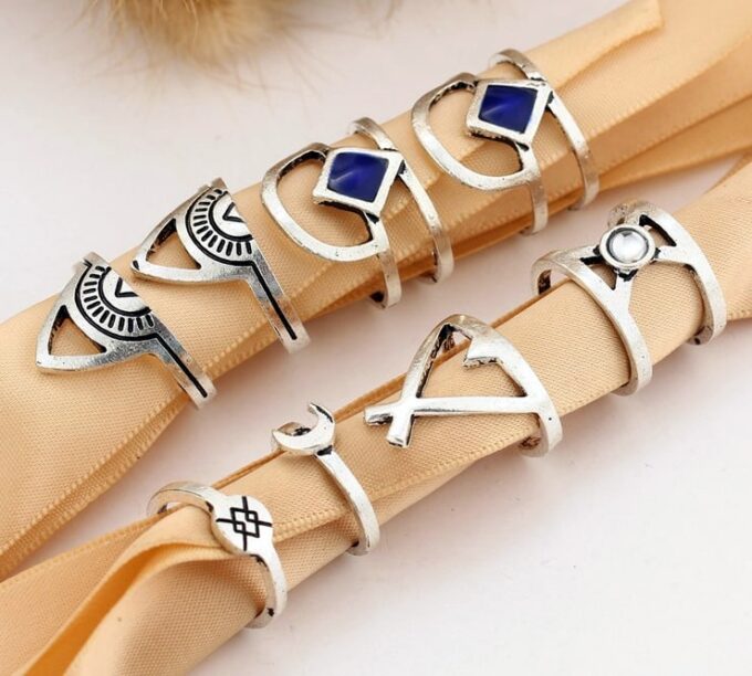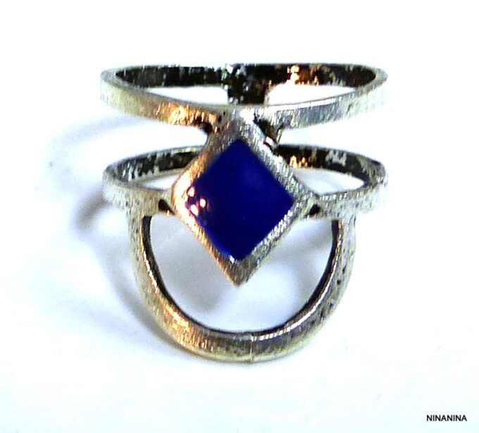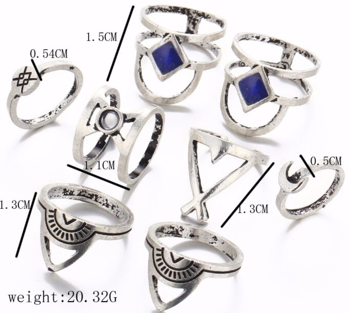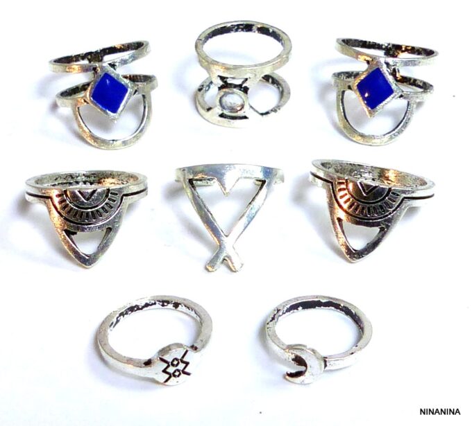 Lot de 8 bagues bohème en métal argenté et résine bleue. Diamètre : de 1,4 à 1,8 cm. Livré dans sa pochette d’organza.