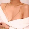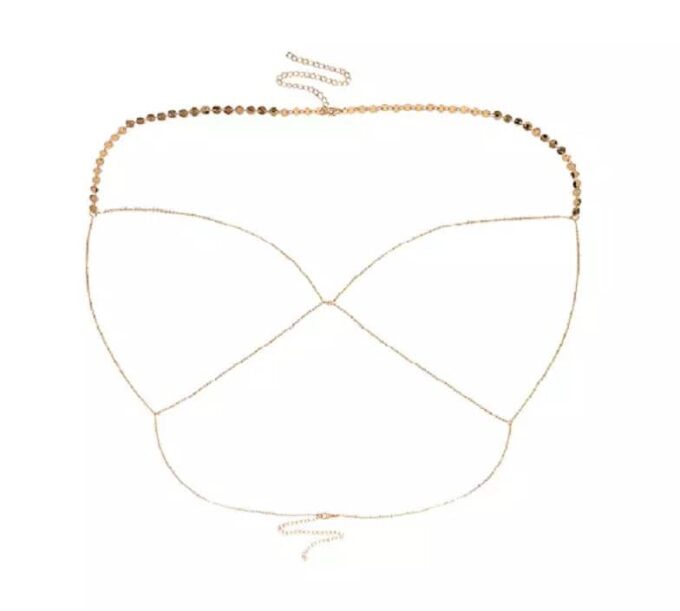 Découvrez les multiples facettes de la séduction et laissez-vous surprendre ce magnifique Soutien gorge chainette dorée – Bijou chaine de sein doré sensuel et raffiné ! il habillera divinement les bustes et épaules féminines avec ses petits disques dorés aux bretelles et ses fines chainettes. •