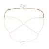 Ce bijou soutien-gorge ornera les poitrines du bonnet A au bonnet G avec ses chainettes dorées. Ses petits disques dorés aux bretelles embraseront le désir en sublimant le buste et les épaules. Ce bijou or apporte modernité et glamour. offre un décolleté plongeant sensationnel, sublimé par un bijou strass et or à l’entre-sein.