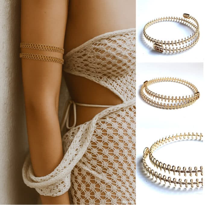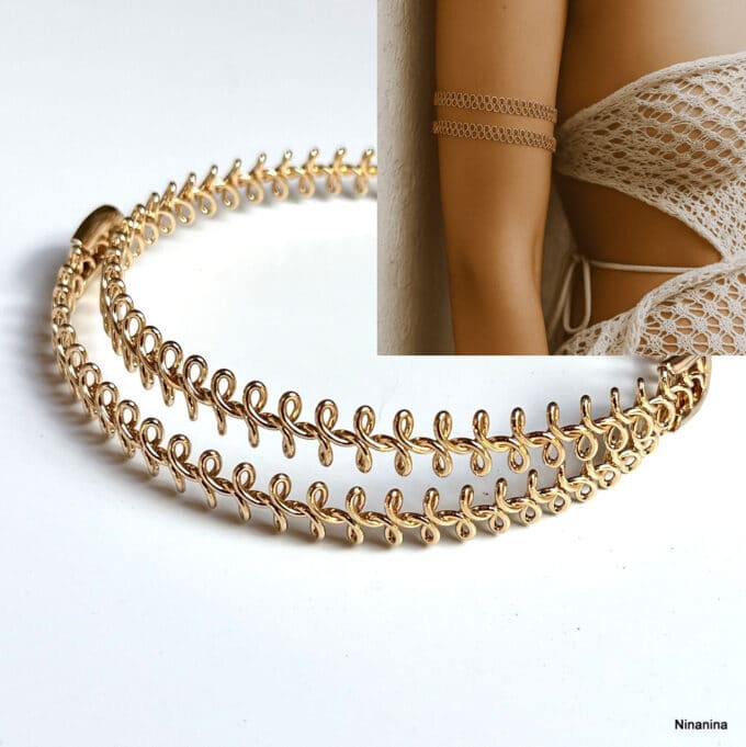 Large de 10mm, une jolie maille fantaisie qui entoure le haut du bras de deux rangs de volutes dorées, ce splendide Bijou ethnique apportera une touche mystérieuse à votre look.