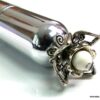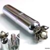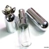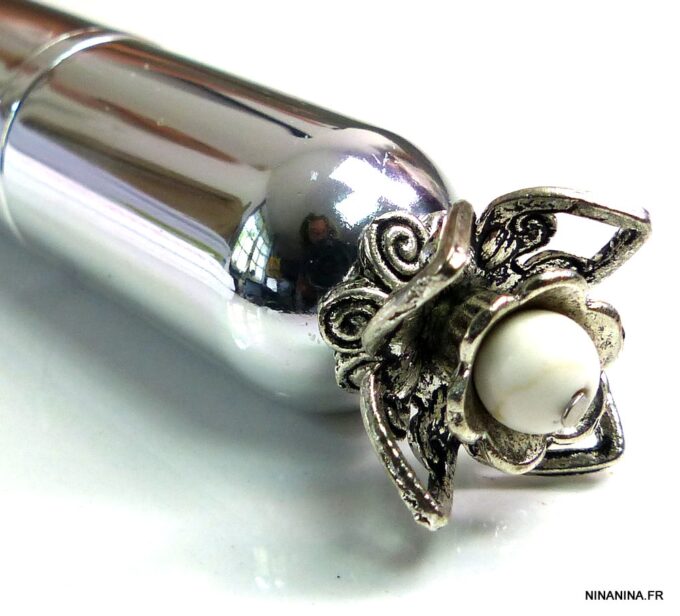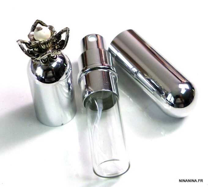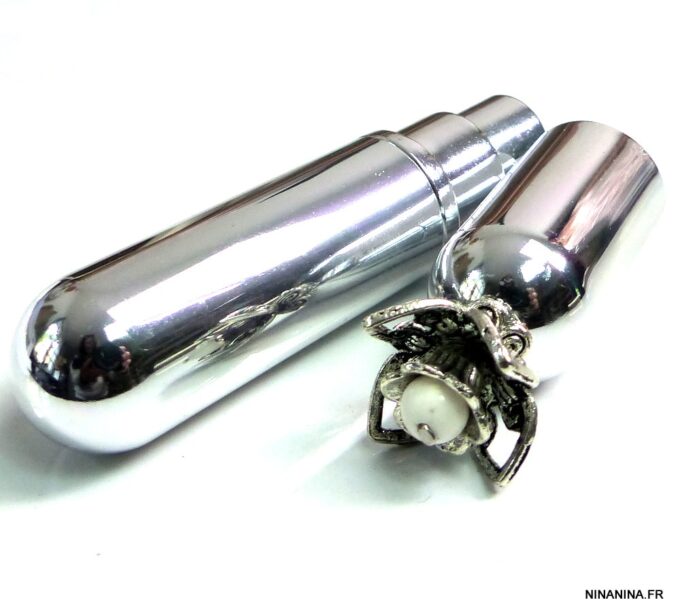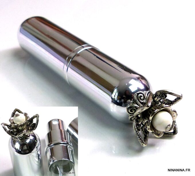 Parfum de poche métal argenté et pierre turquoise bleue composé d’un flacon cylindrique en verre et métal argenté, assorti d’une pompe en métal argenté, rehaussé d’une petite turquoise blanche ronde. Contenance : 5 ml. Dimensions totale : 10,5 x 1,9 cm env. Mini entonnoir fourni. Livré dans sa pochette d’organza. Bijou 100% fait-main.
