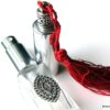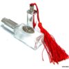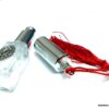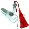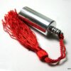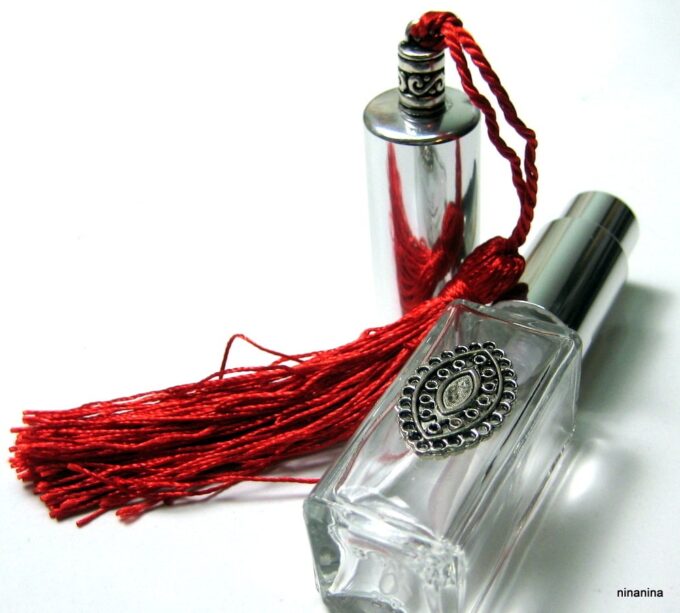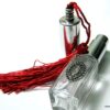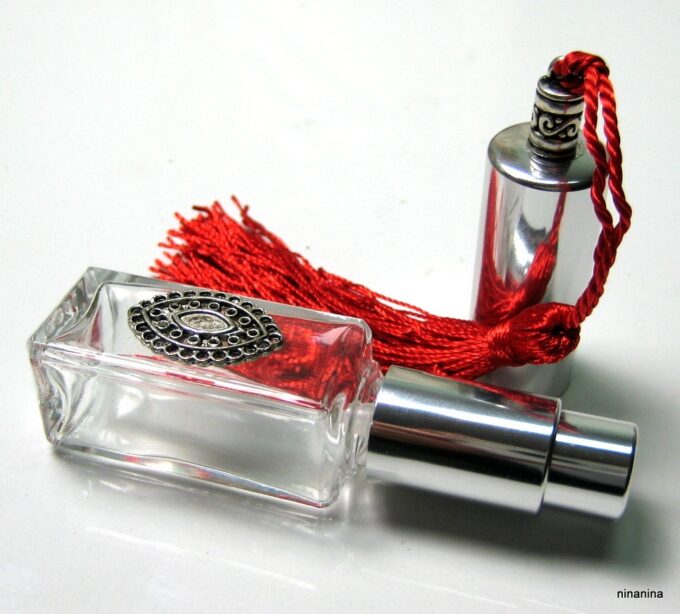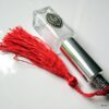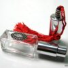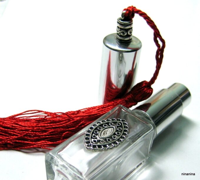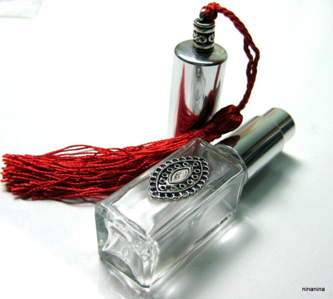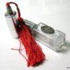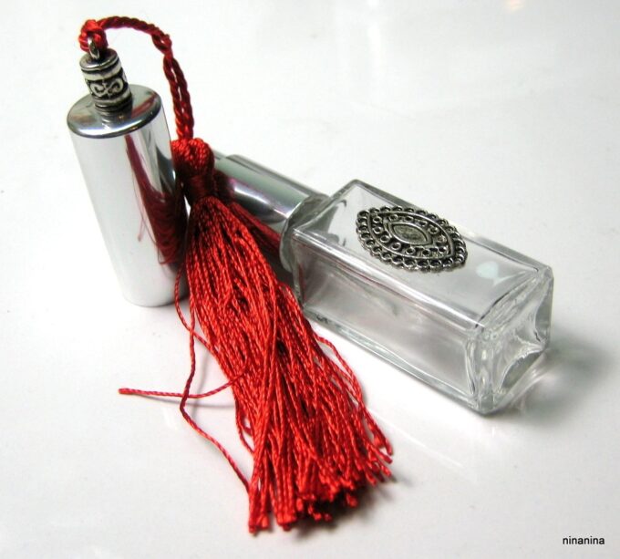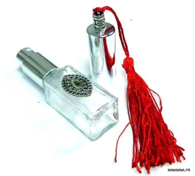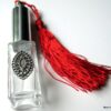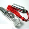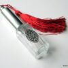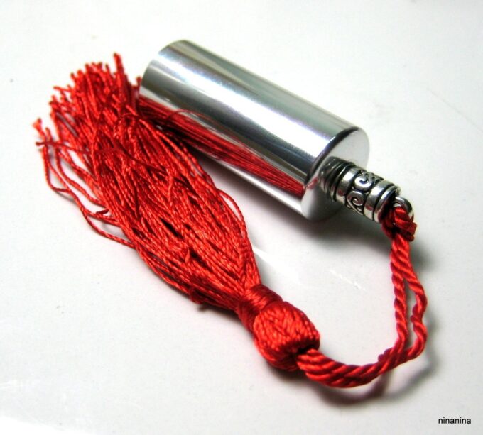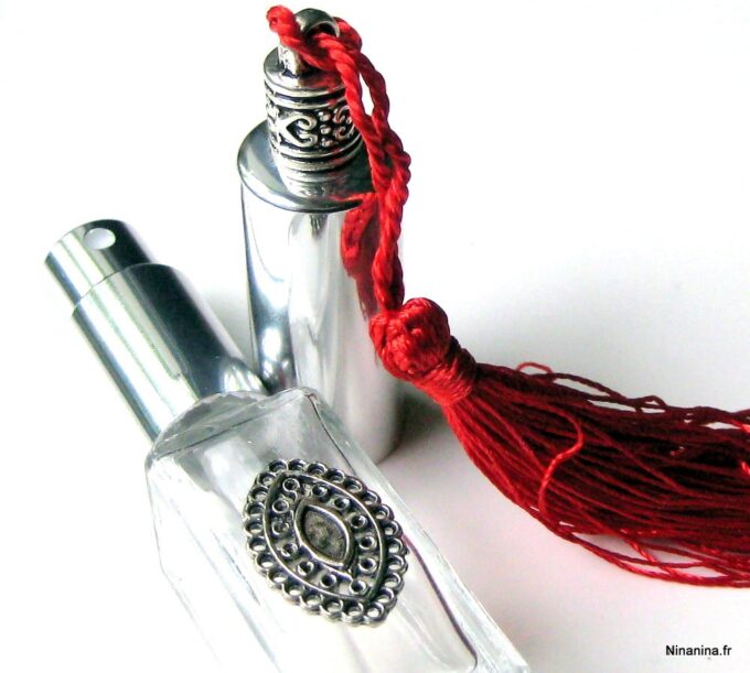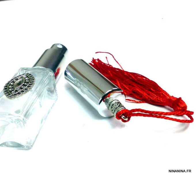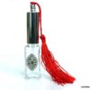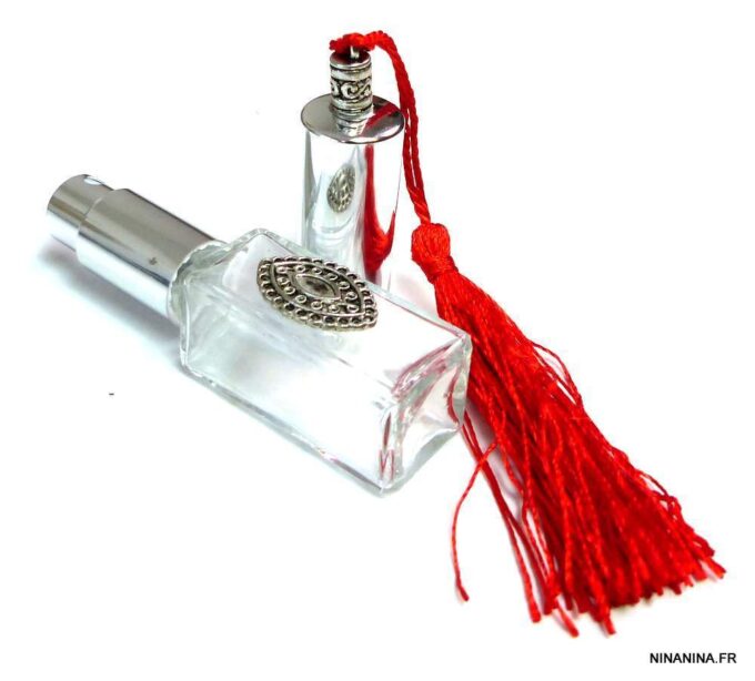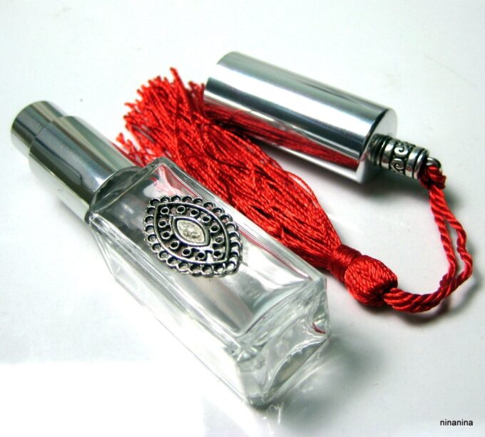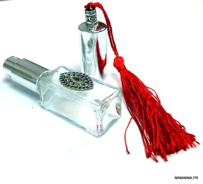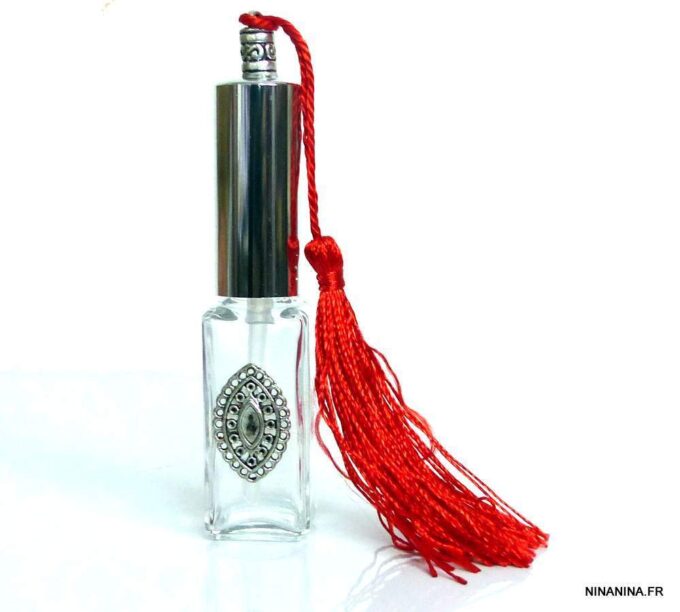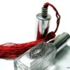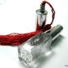 Flacon de parfum original en verre pompon rouge composé d’un flacon rectangulaire en verre sur lequel est collé une estampe en métal argenté, assorti d’une pompe en métal argenté rehaussé d’un petit pompon rouge en coton perlé. Contenance : 7,5 ml. Dimensions totale : 9 x 2 cm env. Longueur du pompon : 11 cm env. Mini entonnoir fourni. Livré dans sa pochette d’organza. Bijou 100% fait-main.